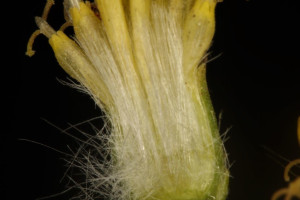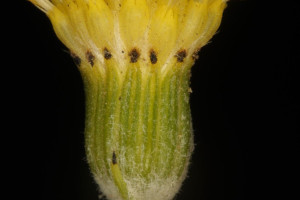 Capítulos amarillos; involucro verde; filarias verdes con puntas moradas