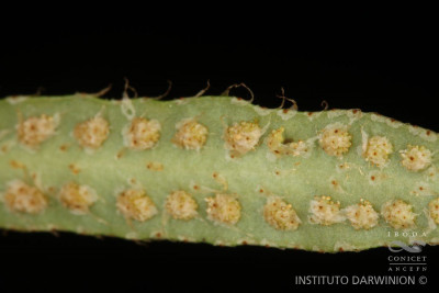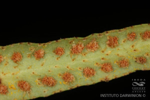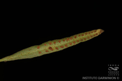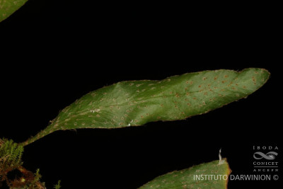 Epífita, escamas rojizas, soros castaños. Hojas dimórficas