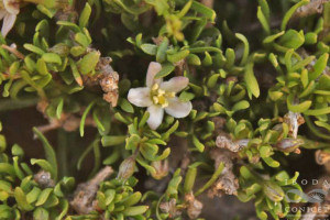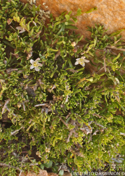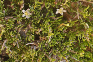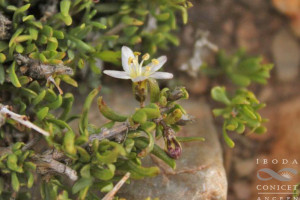 Flor blanca con tintes violáceos en el centro. Subfrútice, adpreso a roca