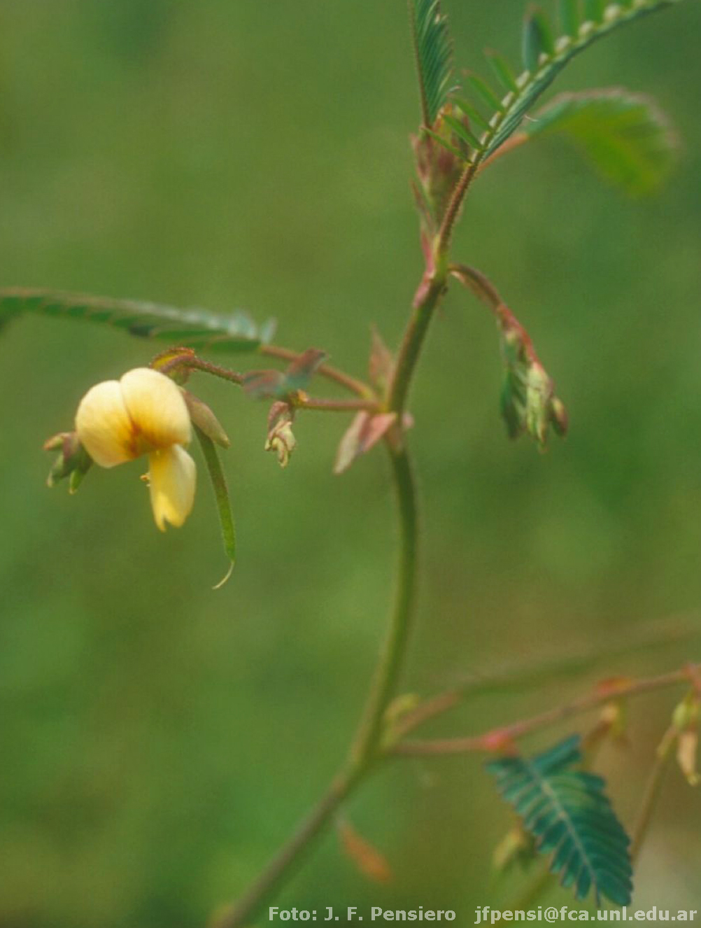 Planta perenne, 50- 80 cm alt. Tallos erectos, 3,5- 8 mm de diám. setosos, setas amarillas, de base tuberculada, densas en partes jóvenes de la planta. Hojas 6-30 yugadas.Estípulas peltadas, asimétricas, en la inserción del tallo, setas en el margen; aurículas 1-3 mm long., lámina 4-8 mm long. sólo en las partes jóvenes, el resto caducan. Pecíolos con el indumento del tallo, 4-16 mm long., raquis 17-89 mm long. Folíolos 6-30 pares, 4-11 mm long.x 1-3 mm lat., subopuestos, oblongos, obtusos, mucronados, asimétricos en la base, margen dentado, con una seta en cada diente, punteado-glanduloso en el epifilo. Brácteas 2,5-4 mm long., peltadas, ovales, agudas, con setas en el margen. Flores 10-12 mm long., amarillo-anaranjadas, con estrías rojas en el estandarte. Pedúnculos setosos, pedicelos breves 1,5-2,5 mm long. Cáliz bibracteado, ca. 7 mm long., bilabiado, labio superior con dos lóbulos, el inferior tridentado. Pétalos unguiculados, estandarte 10,5 mm long., lámina elíptica, con setas en el ápice,. uña 0,5 mm long.; alas 9 mm long., oblongas, setas en el margen superior; quilla incurva. Ginóforo 8-11 mm long. Lomento con 8-14 artejos, borde placentar liso recto, el opuesto sinuoso. Artejos 3-5 mm long.x 3,4 mm lat. cuadrados, con setas, comprimidos achatados lateralmente, abultados en la cavidad seminal, donde son verrucosos y con setas.