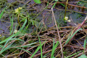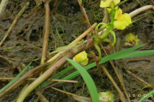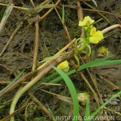 Hierbas acuáticas sumergidas, libres, robustas, probablemente perennes. Rizoides ausentes. Estolones de varios metros de largo y de 1-4 mm de ancho, elípticos en sección transversal, glabros y mucilaginosos; entrenudos de 2-15 cm de largo. Ejes aéreos de 20 cm de largo × 0,5 mm de ancho, filiformes, con escamas ovaladas en el ápice. Órganos foliares hasta de 45 cm de largo, alternos, de contorno ovado, pinnados, generalmente dimórficos (algunos con menos segmentos y numerosas trampas, otros con segmentos más numerosos y pocas o ninguna trampa), segmentos finales filiformes, lateralmente y apicalmente setulosos. Utrículos de 1-2 mm de largo, laterales, cerca de la base de los penúltimos segmentos de los órganos foliares, ovoides a globosos, brevemente pedicelados, boca lateral con 2 apéndices setiformes desiguales, escasamente ramificados o no. Inflorescencia de 7-45 cm de largo, erecta, emergente, simple; pedúnculo hasta de 5 mm de diámetro, recto, terete, glabro; escamas ausentes o 1-2 por debajo de la flor más basal de la inflorescencia; brácteas de 2-4 mm de largo, basifijas, ovadas de ápice truncado a levemente acuminadas; bractéolas ausentes; flores 3-20; pedicelos filiformes, curvos, de 0,4-0,6 cm de largo, dorsiventralmente comprimidos, glandulares, cortos y erectos en la antesis, alargados y decurrentes en el fruto; lóbulos del cáliz ovados, de 3-5 mm de largo, subiguales, algo carnosos, glandulares, connados en la base, ápice del lóbulo superior obtuso y del lóbulo inferior 2- o 3-dentado; corola de 0,8-1,5 cm de largo, amarilla, a veces con nervios púrpuras, labio superior circular o elíptico, de ápice redondeado; labio inferior con el limbo relativamente más grande, elíptico a subreniforme, base con una prominente hinchazón redondeada y el ápice redondeado o retuso; margen del paladar levemente papiloso; espolón cónico con el ápice obtuso o emarginado, recto, superficie interna en el lado dorsal con numerosas glándulas diminutas, generalmente dispuestas en 2 parches oblongos, uno a cada lado del nervio central; filamentos estaminales curvos; ovario globoso, óvulos pocos; estilo corto, estigma con el labio inferior circular, a menudo híspido y ciliado, labio superior mucho más pequeño, semicircular o deltoideo con ápice agudo, obtuso, emarginado o 2-dentado. Fruto una cápsula hasta de 8 mm de diámetro, globosa, indehiscente, escasamente cubierta de glándulas sésiles globulares y deprimidas, pedúnculo curvo. Semillas 4-12, lenticulares, con un ala estrecha y regular de 2-2,5 mm de diámetro total.