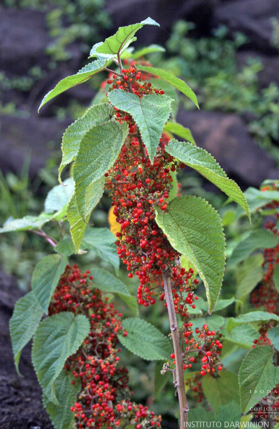 Sufrútices apoyantes, a veces rastreros con tallos estoloníferos, hasta de 4 m de alto, dioicos; tallos estriados, velutinos. Hojas con lámina ovado-lanceolada, de 6-15 × 3-8 cm, ápice acuminado, margen dentado, cara adaxial con tricomas urticantes y cistolitos, cara abaxial velutina con tricomas urticantes en la nervadura central. Inflorescencias en cimas dicotómicas, axilares. Flores estaminadas 4-meras, perigonio con tépalos connados en la base; pistilodio presente. Flores pistiladas con perigonio adpreso al pistilo, carnoso, acrescente; ovario ovoide, estigma sésil, capitado. Fruto un aquenio globoso, ca. 1 mm de diámetro, estigma y perigonio (anaranjado-rojizo) persistentes.