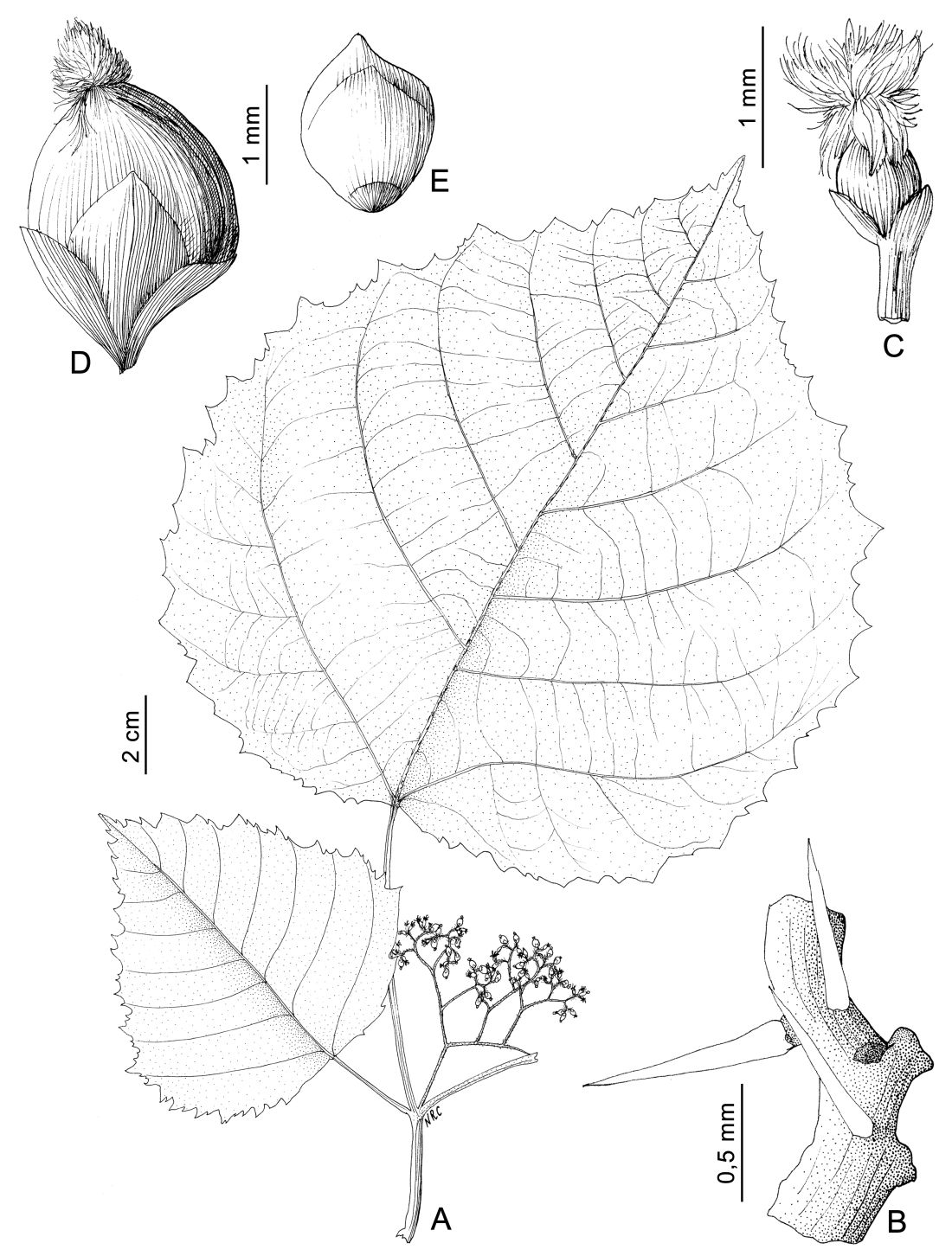 A. Rama florífera. B. Detalle de los tricomas urticantes del tallo. C. Flor pistilada. D. Fruto. E. Semilla.