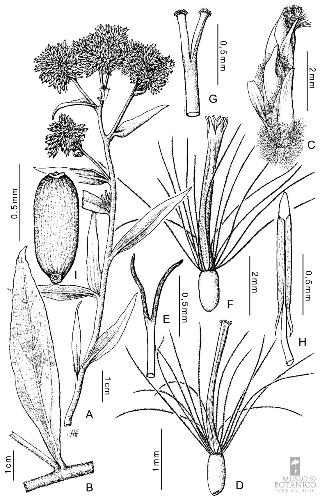 A. Rama florífera. B. Hoja. C. Capítulo. D. Flor del margen. E. Ramas del estilo de la flor marginal. F. Flor del centro. G. Ramas del estilo de la flor del centro. H. Estambre. I. Aquenio.