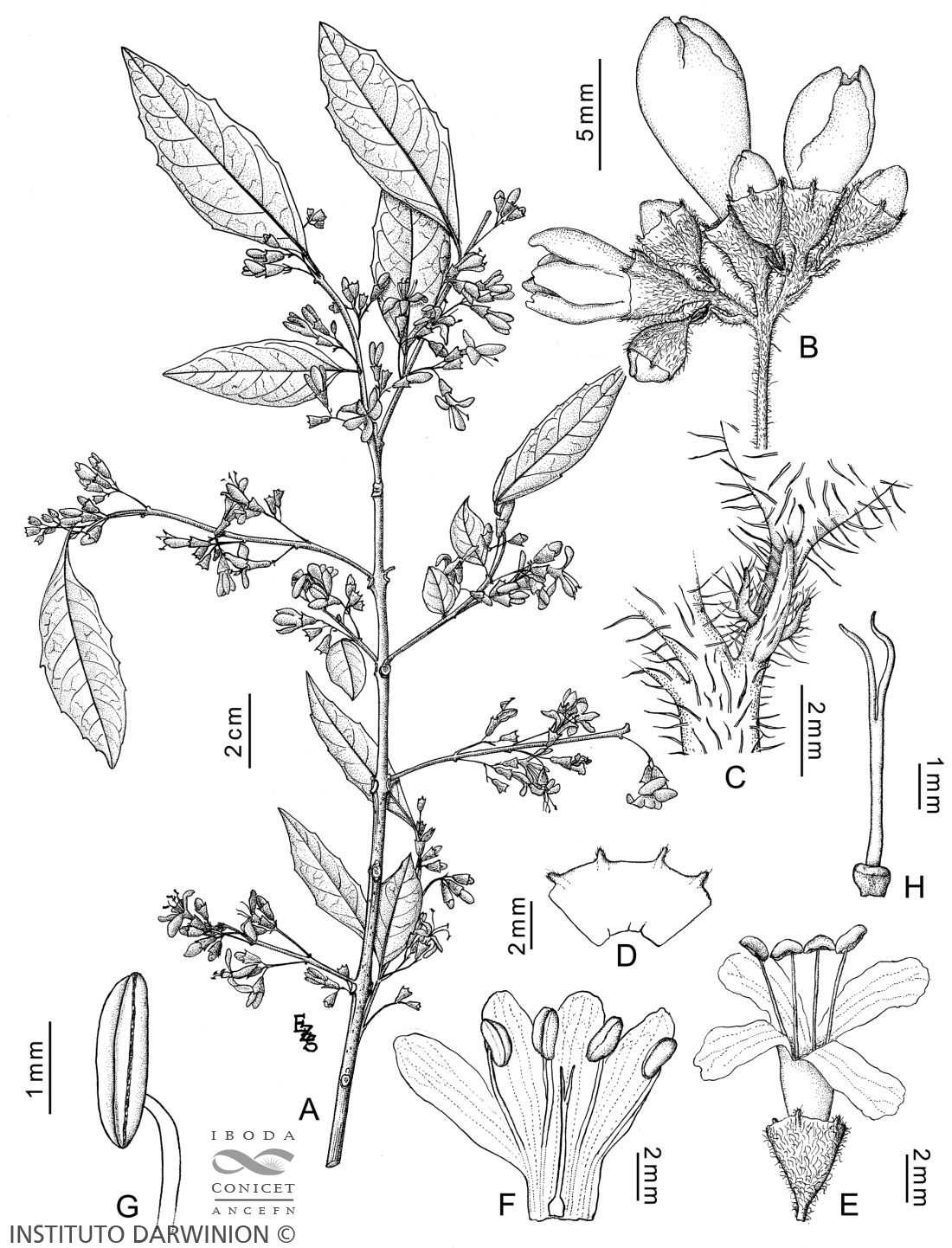 A. Rama con flores estaminadas. B. Inflorescencia estaminada. C. Base de la inflorescencia estaminada, se observa el raquis con una bráctea y un pedicelo con sus bractéolas. D. Cáliz desplegado. E. Flor estaminada. F. Flor estaminada desplegada. G. Estambre. H. Pistilodio.