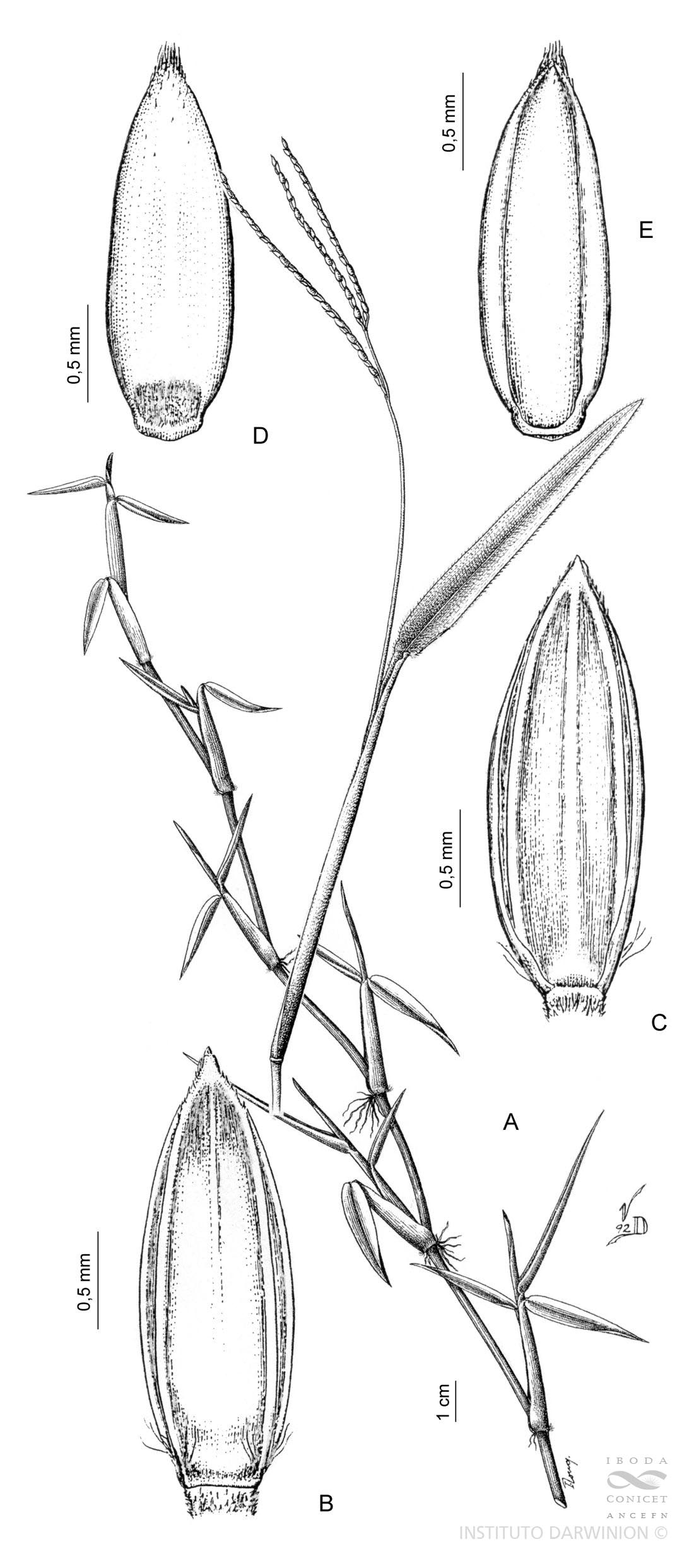Plantas perennes, cespitosas a fuertemente estoloníferas o rizomatosas; cañas erectas a decumbentes, de 10-70(-80) cm de alto; entrenudos 1-4, los inferiores cortos, los superiores hasta de 15 cm de largo; nudos glabros a pilosos, castaños; vainas de 3-11 cm de largo, las inferiores más largas que los entrenudos, glabras, márgenes membranáceos, glabros a pestañosos; lígulas membranáceo-ciliadas, de 0,3-0,7 mm de largo; cuello distinguible, glabro; láminas linear-lanceoladas a lanceoladas, de 3,5-14(-25) x (0,5-)0,7-1,2 cm, glabras a esparcidamente pilosas en ambas caras, de base subcordada y ápice obtuso a subagudo, los márgenes escabriúsculos, glabros a pestañosos hacia la base, con pelos tuberculados. Inflorescencias terminales y axilares, de 4-12 x 2-5 cm, exertas; pedúnculos 1-4, naciendo del último nudo caulinar, hasta de 35 cm de largo, exertos a subincluidos en las vainas foliares, teretes, glabros, lisos; eje principal de 0-2,5 cm de largo, anguloso, glabro, liso; racimos (2-)3-6(-9), ascendentes, divergentes, alternos, los superiores conjugados; raquis de los racimos triquetro, de 3-9(-13) cm x 0,4-0,7 mm, glabro; pulvínulos glabros; pedicelos 0,2-0,4 mm de largo, tan anchos como la base de la espiguilla, escabriúsculos. Espiguillas ovoides, de (1,8-)2-2,6(-3) x 0,8-1,2 mm, de ápice acuminado, glabras a esparcidamente pilosas, con pelos adpresos a lo largo de los nervios marginales y el ápice; gluma superior y lemma inferior subiguales, 0,4-0,8 mm más largas que el antecio superior; gluma superior de 2-2,6(-3) mm de largo, 2-4(-5) nervia, con el nervio medio generalmente ausente; lemma inferior glumiforme, 2-4(-5) nervia, nervio medio generalmente ausente; antecio superior elipsoide, de 1,4-2,4 x 0,7-0,9 mm, de ápice obtuso, pajizo, finamente papiloso, piloso junto al ápice, con un mechón de pelos blanquecinos; pálea de similar textura y ornamentación que la lemma, glabra; lodículas 2, de 0,2-0,3 mm de largo; anteras 3, estambres de 1,2-1,5 mm de largo; cariopsis elipsoide, de 1,6 x 0,6 mm; hilo oblongo, subbasal; embrión ? del largo de la cariopsis.