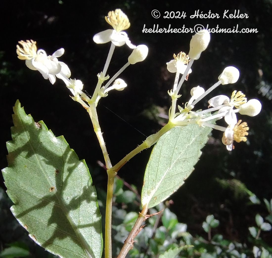 Subarbustos escandentes, creciendo sobre árboles o entre rocas y alcanzando hasta 2 m de alto, glabros. Tallos escandentes, subleñosos, estriados, muy ramificados, castaños, pubérulos cuando jóvenes, con tricomas simples, ferrugíneos. Estípulas triangulares o lanceoladas, de 0,4-1 × 0,1-0,3 cm, de base truncada, ápice mucronulado y margen entero, membranáceas, persistentes, erectas, glabrescentes. Pecíolos emergiendo a partir de los tallos, de 2-5,9 mm de largo, cilíndricos, glabros. Láminas enteras, basifijas, levemente asimétricas, elípticas o menos frecuentemente ovadas, de 4,5-8 × 1,5-2,5 cm, de base aguda o atenuada, ápice acuminado y margen aserrado y esparcidamente ciliado, papiráceas, cara adaxial verde, la abaxial verde o rojiza, penninervias. Cimas paucifloras a multifloras; pedúnculos de 0,5-2 cm de largo; brácteas 1 par, triangulares a lanceoladas, persistentes, de 3-8 × 1- 2 mm. Flores estaminadas con 4 tépalos blancos o verdosos, los externos ovados u obovados, de 3-5 × 2-3 mm, los internos elípticos u obovados, de 2-5 × 1-2 mm; bractéolas 1-3 pares, lanceoladas, de 2 × 1 mm, persistentes; estambres 10-20, ca. 3 mm de largo, filamentos libres, anteras elípticas u oblongas, ca. 1 mm de largo, introrsas. Flores pistiladas con 5 tépalos subiguales, imbricados, lanceolados, de 2-4 × 1 mm, blancos o verdosos; bractéolas 1-3 pares, lanceoladas, de 2-3 × 1 mm, persistentes; hipanto glabro; estilos de 4-5 mm de largo; ramas estigmáticas ca. 1 mm de largo. Cápsulas de 0,5-1 × 0,3-0,6 cm, placentas enteras; alas rudimentarias, semejantes entre sí. Semillas fusiformes.