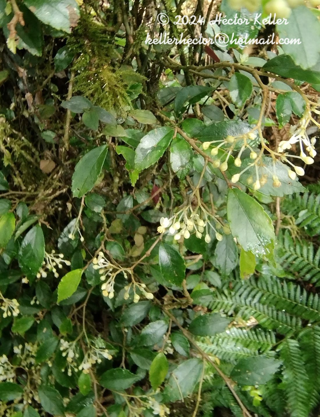 Subarbustos escandentes, creciendo sobre árboles o entre rocas y alcanzando hasta 2 m de alto, glabros. Tallos escandentes, subleñosos, estriados, muy ramificados, castaños, pubérulos cuando jóvenes, con tricomas simples, ferrugíneos. Estípulas triangulares o lanceoladas, de 0,4-1 × 0,1-0,3 cm, de base truncada, ápice mucronulado y margen entero, membranáceas, persistentes, erectas, glabrescentes. Pecíolos emergiendo a partir de los tallos, de 2-5,9 mm de largo, cilíndricos, glabros. Láminas enteras, basifijas, levemente asimétricas, elípticas o menos frecuentemente ovadas, de 4,5-8 × 1,5-2,5 cm, de base aguda o atenuada, ápice acuminado y margen aserrado y esparcidamente ciliado, papiráceas, cara adaxial verde, la abaxial verde o rojiza, penninervias. Cimas paucifloras a multifloras; pedúnculos de 0,5-2 cm de largo; brácteas 1 par, triangulares a lanceoladas, persistentes, de 3-8 × 1- 2 mm. Flores estaminadas con 4 tépalos blancos o verdosos, los externos ovados u obovados, de 3-5 × 2-3 mm, los internos elípticos u obovados, de 2-5 × 1-2 mm; bractéolas 1-3 pares, lanceoladas, de 2 × 1 mm, persistentes; estambres 10-20, ca. 3 mm de largo, filamentos libres, anteras elípticas u oblongas, ca. 1 mm de largo, introrsas. Flores pistiladas con 5 tépalos subiguales, imbricados, lanceolados, de 2-4 × 1 mm, blancos o verdosos; bractéolas 1-3 pares, lanceoladas, de 2-3 × 1 mm, persistentes; hipanto glabro; estilos de 4-5 mm de largo; ramas estigmáticas ca. 1 mm de largo. Cápsulas de 0,5-1 × 0,3-0,6 cm, placentas enteras; alas rudimentarias, semejantes entre sí. Semillas fusiformes.
