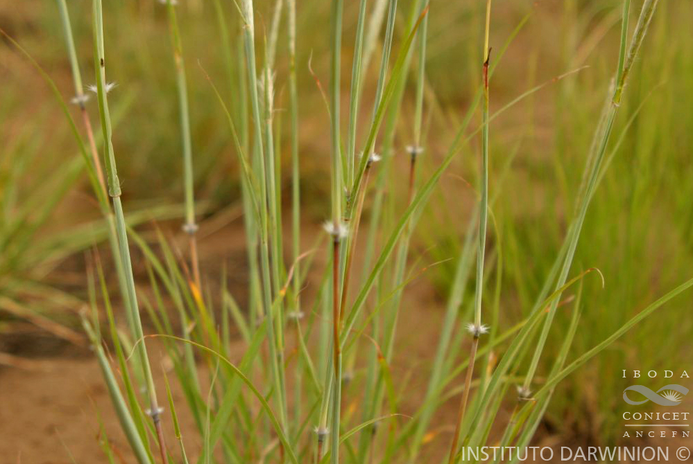 Plantas de 90-120 cm de alto, cespitosas, follaje caulinar; cañas erectas, decumbentes, ramificadas; nudos pilosos; vainas glabras; lígulas de 2-2,5 mm de largo; láminas de 20-30 cm x 3-7 mm, planas, hirsutas o glabras; zona ligular hirsuta. Inflorescencia una panícula oblonga, de 9,5-15,5 x 3-7 cm, densiflora, ramificaciones glabras en la base. Espiguilla pedicelada de 4-7 x 0,3-0,5 mm, 7-9-nervia, escabrosa, reducida, neutra; gluma inferior incurvada. Espiguilla sésil de 5-6,5 x 1-1,2 mm, elipsoide, casmógama; gluma inferior de 9-10-nervia, plana o con surco poco pronunciado, ocasionalmente foveolada, escabrosa en el margen hacia el ápice, pilosa en la mitad inferior del dorso; gluma superior de 5-5,8 mm de largo, carina escabrosa hacia el ápice; lemma inferior de 3-4,5 mm de largo, arista de 14-25 mm de largo.