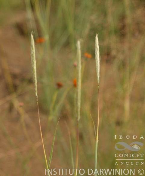 Plantas de 90-120 cm de alto, cespitosas, follaje caulinar; cañas erectas, decumbentes, ramificadas; nudos pilosos; vainas glabras; lígulas de 2-2,5 mm de largo; láminas de 20-30 cm x 3-7 mm, planas, hirsutas o glabras; zona ligular hirsuta. Inflorescencia una panícula oblonga, de 9,5-15,5 x 3-7 cm, densiflora, ramificaciones glabras en la base. Espiguilla pedicelada de 4-7 x 0,3-0,5 mm, 7-9-nervia, escabrosa, reducida, neutra; gluma inferior incurvada. Espiguilla sésil de 5-6,5 x 1-1,2 mm, elipsoide, casmógama; gluma inferior de 9-10-nervia, plana o con surco poco pronunciado, ocasionalmente foveolada, escabrosa en el margen hacia el ápice, pilosa en la mitad inferior del dorso; gluma superior de 5-5,8 mm de largo, carina escabrosa hacia el ápice; lemma inferior de 3-4,5 mm de largo, arista de 14-25 mm de largo.