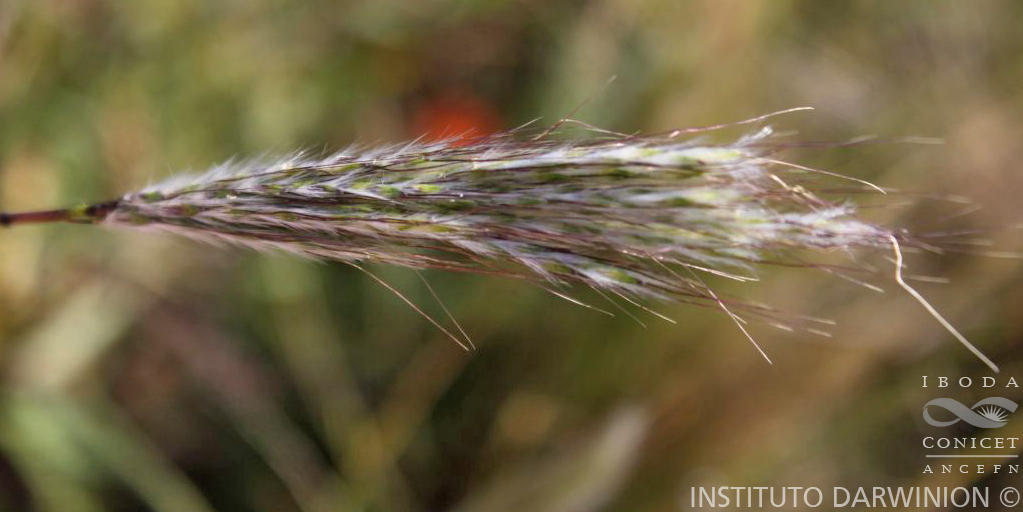 Plantas de 90-120 cm de alto, cespitosas, follaje caulinar; cañas erectas, decumbentes, ramificadas; nudos pilosos; vainas glabras; lígulas de 2-2,5 mm de largo; láminas de 20-30 cm x 3-7 mm, planas, hirsutas o glabras; zona ligular hirsuta. Inflorescencia una panícula oblonga, de 9,5-15,5 x 3-7 cm, densiflora, ramificaciones glabras en la base. Espiguilla pedicelada de 4-7 x 0,3-0,5 mm, 7-9-nervia, escabrosa, reducida, neutra; gluma inferior incurvada. Espiguilla sésil de 5-6,5 x 1-1,2 mm, elipsoide, casmógama; gluma inferior de 9-10-nervia, plana o con surco poco pronunciado, ocasionalmente foveolada, escabrosa en el margen hacia el ápice, pilosa en la mitad inferior del dorso; gluma superior de 5-5,8 mm de largo, carina escabrosa hacia el ápice; lemma inferior de 3-4,5 mm de largo, arista de 14-25 mm de largo.