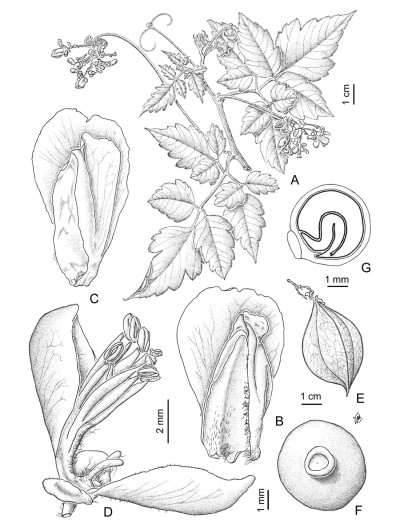 Subarbustos trepadores; indumento variable, pubescente, tricomas simples, blanquecinos, amarillentos u ocráceos, sedosos, curvos y tricomas glandulares en el tallo, ejes de la hoja e inflorescencia y frutos pubescentes; o tallos y pedúnculo de la inflorescencia pubérulos, folíolos pubérulos a glabros y frutos glabros; o tallos, ejes de la hoja y pedúnculo de la inflorescencia con setas hasta de 3-3,5 mm de largo, folíolos sólo con escasas setas sobre la vena media y frutos glabros; tallos jóvenes con 5-6 costillas, a veces fistulosos, cuando adultos subteretes con estriaciones leves. Hojas con estípulas triangulares, de 0,75- 1,25 mm de largo, pubescentes; pecíolo de 5-68 mm de largo, canaliculado o bicanaliculado; lámina compuesta, 2-yugada, la yuga basal con 3 foliólulos; raquis primario de 10-41 mm de largo, ráquises secundarios de 5-20 mm de largo, ambos 2-canaliculados; peciólulo del folíolo terminal notable, de 3-23 mm de largo, marginado o angostamente alado, de menor largo o nulo en los demás; folíolos ovado-anchos, ovados, con menos frecuencia ovado-angostos, ciliados; los foliólulos laterales internos siempre pequeños, de 1-7 × 0,9-4 cm, cartáceos, discoloros; base redondeada o decurrente en el folíolo y foliólulos terminales, generalmente redondeada en los demás, ápice atenuado u obtuso en el folíolo terminal, agudo u obtuso en los restantes, mucronado, margen dentadoserrado, 3-15 dientes obtusos por lo común con una glándula apical, a veces inciso-dentado con 2-4 incisiones basales que no superan 1/3 de la semilámina, ciliado; cara adaxial y abaxial glabras, o pubescentes, siendo más notable y densa la pubescencia con tricomas más largos en la cara abaxial, axilas barbadas o domacios en bolsillo. Inflorescencias en tirsos con pedúnculo y raquis desarrollados, 2 zarcillos en la base del raquis, cincinos subverticilados, pauci- o plurifloros; pedúnculo de 4-24 mm de largo; pedicelo floral de 3-6,5 mm de largo, en el fruto de 7-10 mm de largo, articulado en 1/4 basal o ca. de la mitad; brácteas triangular-subuladas, de 1,5-3 mm de largo, pubescentes. Flores de (5,5-)6-9,25(-17) mm de largo; sépalos externos suborbiculares, de 1,75-3 mm de largo, blancoverdosos, glabros en la cara interna, setulosos en la cara externa, sépalos internos obovados u ovado-angostos, cuculados, de 4,5-8 mm de largo, con sétulas en la porción basal, tricomas glandulares en el margen; pétalos obovados, de 5,25-9 mm de largo, escasamente glandulosos en la cara interna, escama de los pétalos posteriores de 3,5-7 mm de largo, con cresta entera, emarginada o erosa, apéndice deflexo lingüiforme, cresta amarillo-oro; lobos nectaríferos 2, corniculiformes, de 1,25-3 mm de alto, pubérulos, cubiertos por la escama de los pétalos posteriores; androginóforo pubérulo o pubescente blanquecino; estambres de la flor estaminada de 4,25-7,5 mm de largo, filamentos acintados, conniventes en la base, glabros o pubescentes, anteras espi