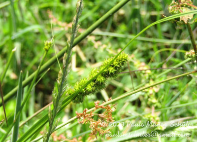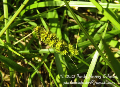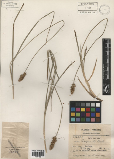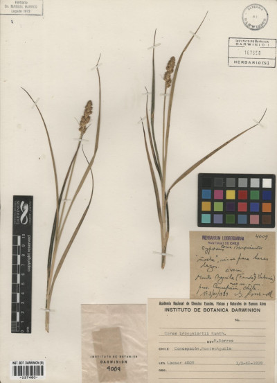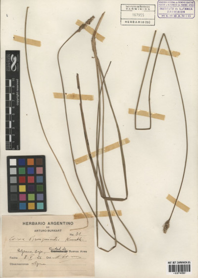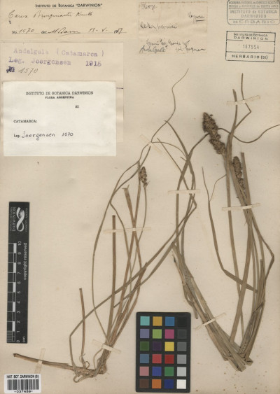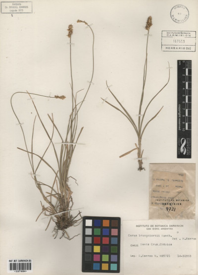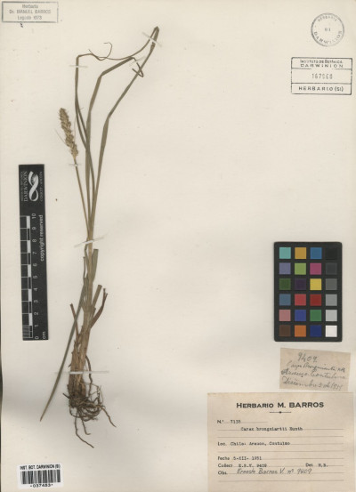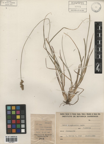 Observaciones: Iconography: Figures 1I, 2U, 3U. See additional figures in Gay (1854: tab. 73, fig. 10), Barros (1935: 198; 1947: tab. 177), and Silveira & Longhi-Wagner (2010; 2012: 383). Etymology: Commemorating Adolphe T. Brongniart, 1801–1876, a leading French plant taxonomist of the 19th century. Notes: Originally cited by Brongniart (1833) as Carex muhlenbergii Willd. The taxon was soon recognized as an independent species. Selected additional references: Pedersen [(1968) description], Silveira & Longhi-Wagner [(2010) ecology, (2012) description].