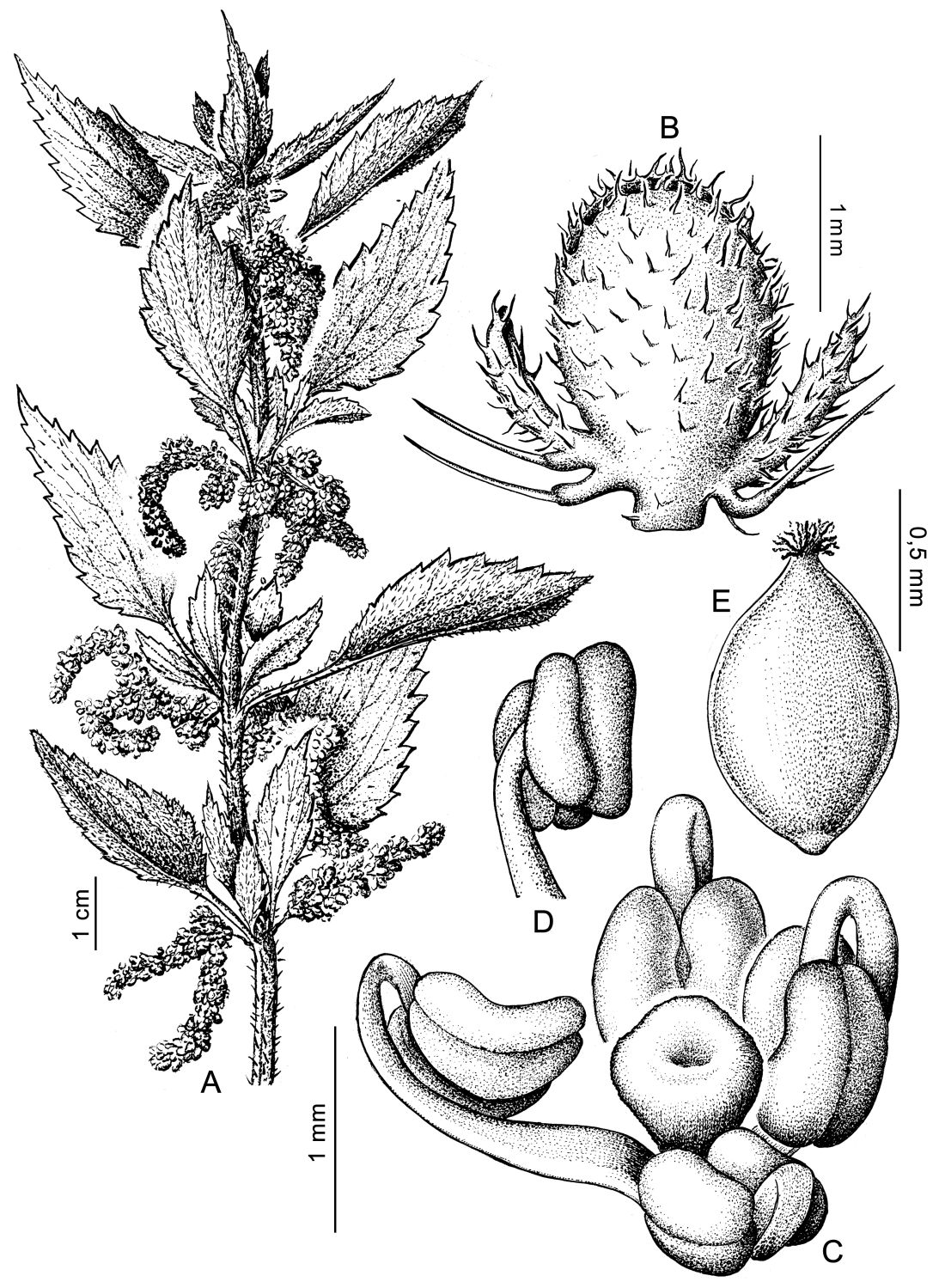 Hierbas perennes, dioicas, raro monoicas, rizomatosas, hasta de 2 m de alto; tallos erectos, 4-gonos, con tricomas urticantes. Hojas opuestas; pecíolo de 1-4 cm de largo; lámina ovada o lanceolada, en ocasiones elíptica, de 5-15 × 1-6 cm de largo, margen serrado, en ocasiones doblemente serrado, el diente apical acuminado, cara adaxial con tricomas urticantes ralos, breves, con cistolitos, la abaxial con tricomas urticantes, principalmente sobre las nervaduras. Inflorescencias paniculiformes, axilares, subtendidas por una bráctea foliosa. Flores estaminadas ca. 1,5 mm de diámetro. Flores pistiladas de 2,4-3 mm de diámetro. Aquenio ovoide, de 1-1,4 mm de largo.