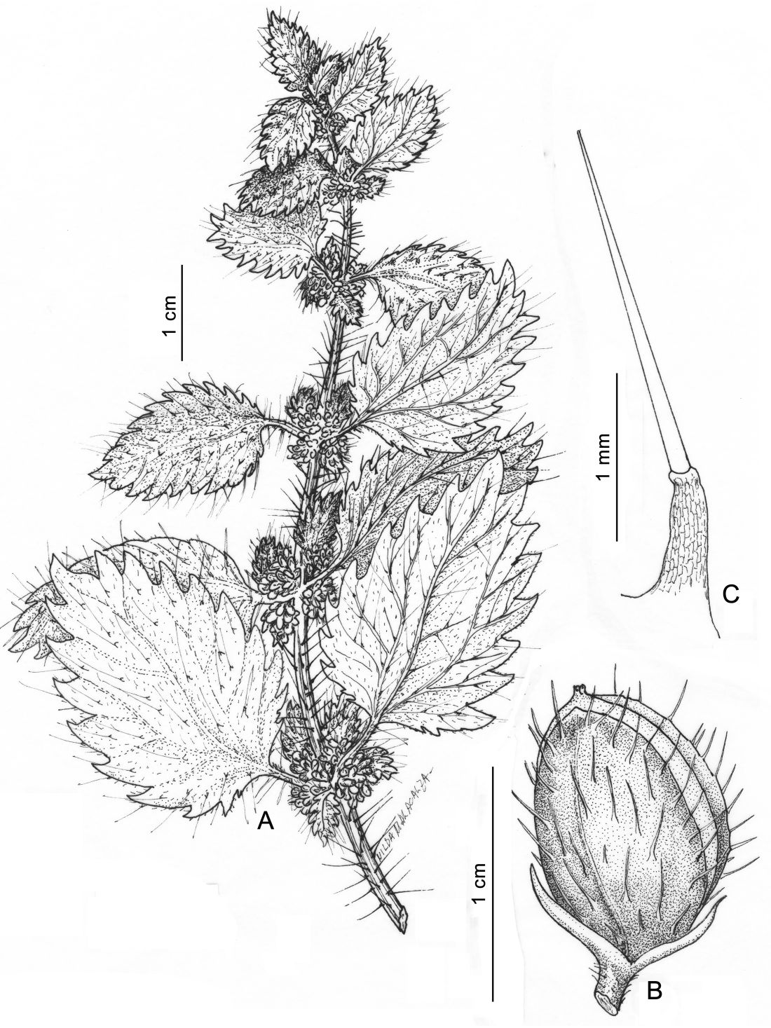 A. Rama florífera. B. Flor pistilada. C. Tricoma urticante.