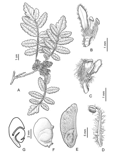 Árboles semideciduos, de 4-18 m de alto; tronco de 0,10- 0,40 m de diámetro; corteza delgada, algo agrietada, parduzca; indumento denso de tricomas simples, breves, curvos o crespos, a veces un segundo estrato de tricomas sedosos, largos, blanquecinos a ocráceos en el ápice de ramas jóvenes, ejes de la hoja, cara externa de los segmentos alados del raquis y de los folíolos, ejes de la inflorescencia, brácteas, bractéolas, y en el cáliz; ramas floríferas de 1,5-3 mm de diámetro, con lenticelas circulares, castaño-oscuras. Hojas con pecíolo de 1-3 cm de largo, canaliculado; lámina con (5-)9-15 folíolos; raquis de 2-5,5 cm de largo, ala de 0,75-2 mm de ancho; folíolos terminal ovado-angosto, ovado u ovado-ancho, los laterales oblongos u oblongo-angostos, el par de folíolos basales más pequeño, de 0,6-4,2 × 0,3-3 cm, cartáceos; base decurrente en el folíolo terminal, en los restantes cuneada, aguda u obtusa, ápice redondeado, obtuso o retuso, glandular; margen revoluto, en el folíolo terminal 2-4 inciso-dentado, en los demás dentadoserrado con 6-34 dientes agudos u obtusos con glándula apical; cara adaxial verde-oscura, pubescente sobre vena media y laterales, el resto pubérula, además tricomas breves dispersos, cara abaxial verde-grisácea, con indumento denso de tricomas breves, o tricomas en dos estratos o sólo tricomas sedosos largos. Inflorescencias en tirsos; pedúnculo de 1-9 mm de largo; raquis (7,5-)15-25 mm de largo; pedúnculo del cincino de 1-2 mm de largo; pedicelo floral de 2,5-3 mm de largo, de igual largo en el fruto, articulado poco por encima de la base; brácteas ca. 1,25 mm de largo, pubescentes en ambas caras. Flores de 4,7- 6,5 mm de largo; sépalos de 3,5-4 mm de largo, pubescentes en ambas caras, ciliados; pétalos de 3-3,5 mm de largo, ápice obtuso, pubérulos en la cara externa, ciliados, escama ca. 2,5 mm de largo, cresta 2-auriculiforme; nectario velloso, amarillento o incano; estambres de la flor estaminada de 3,25-4,5 mm de largo, en la flor pistilada de 2-2,5 mm de largo; pistilodio pubérulo; gineceo ca. 4 mm de largo, ovario seríceo, estilo ca. 2 mm de largo, pubescente o pubérulo. Frutos mericarpos de 1,7-2,6 × 0,5-0,8 cm, porción seminífera obovoide, lateralmente complanada, castaño-oscura, pubescente, tricomas blanquecinos subadpresos, ala castaño-clara, pubérula, brevemente ciliada; endocarpo glabro. Semillas de 6 × 3,25 mm.