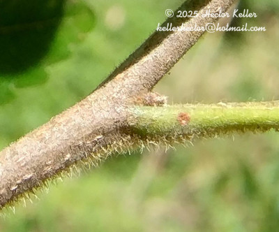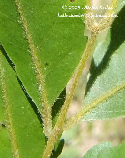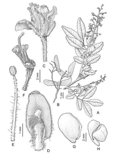 Árboles caducifolios, de (3-)10-20(-30) m de alto, tronco de 0,20-0,60(-1,50) m de diámetro, fuste con costillas marcadas; corteza gris, escamosa, ritidoma delgado; indumento de tricomas glandulares y tricomas simples, largos, blancoamarillentos y sedosos en ramas jóvenes, ejes de las hojas e inflorescencias y verticilos florales; ramas jóvenes con costillas redondeadas, luego teretes, castaño-oscuras, ennegrecidas, con lenticelas puntiformes, glabras; ramas floríferas de 1-2 mm de diámetro. Hojas con pecíolo de 0,8-2 cm de largo, canaliculado; lámina con 8-13 folíolos; raquis canaliculado, de 1,4-6,7 cm de largo; peciólulo de 1-2 mm de largo; folíolos oblongos o elíptico-angostos, el par de folíolos basales notablemente más pequeños, de 1-8 × 0,5-2,8 cm, cartáceos, asimétricos; base aguda u obtusa, ápice obtuso o redondeado, margen dentadoserrado, 11-26 dientes en los 2/3-3/4 distales; cara adaxial brillante generalmente con punteado pelúcido notable, glabra excepto la vena media, cara abaxial opaca, glabra excepto la vena media con tricomas sedosos y largos sobre 1/3 basal. Inflorescencias en tirsos con pedúnculo hasta 3 cm de largo; raquis anguloso estriado a complanado, de 2,7-8 cm de largo, pedúnculo del cincino también complanado, de 2,5-8 mm de largo, cincinos separados por entrenudos notables, pedicelo floral de 3,5-7,5 mm de largo, articulado por debajo de la mitad; brácteas de 0,5-1 mm de largo, pubescentes. Flores de 5-7,5 mm de largo; sépalos subtriangulares, de 2-2,5 mm de largo, pubescentes en la cara externa, ciliados, uno de los sépalos algo más ancho en la base y con ápice 2-dentado; pétalos ca. 4,5 mm de largo, ápice obtuso e inflexo, sublanuginosos en ambas caras, escama de 3-3,25 mm de largo, cresta 2-auriculiforme, a veces emarginada o 2-partida; nectario velloso; estambres de la flor estaminada 4-6 mm de largo, filamentos pubescentes, anteras pubérulas, en la flor pistilada de 3 mm de largo; pistilodio velloso; gineceo 4-5 mm de largo, ovario velloso, estilo ca. 3 mm de largo, pubérulo. Frutos samaridios cartáceos, mericarpos de 2,4-3,8 × 0,7-1 cm, porción seminífera obovoide, castañooscura, glabriúscula, tricomas simples y glandulares, ala castaño-clara, glabra, margen inferior del ala levemente ondulado, a veces ciliado; endocarpo glabro. Semillas de 6,5-7 × 4-5 mm, en posición oblicua ascendente; tegumento pubérulo en parte.