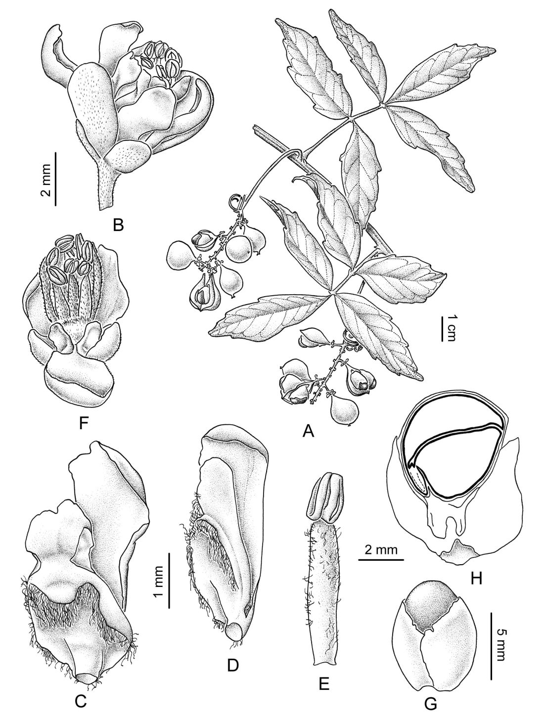 Trepadoras de 5-8 m de alto, glabriúsculas; indumento de tricomas blanquecinos breves, erectos o curvos, en tallos, ejes de la hoja e inflorescencia, densidad variable; tallos 5-6-costados, costillas redondeadas que generalmente alternan con otras prominentes, de sección subtriangular, cuando jóvenes pubescentes luego glabros; cámbiumes supernumerarios 3(-4-5). Hojas con estípulas subuladas, de 3-7 mm de largo, reflexas, escariosas, pubérulas; pecíolo de 1,4-6 cm de largo, 2-canaliculado, glabriúsculo o pubérulo; lámina 2-yugada, (3-)5-foliolada; raquis de 1-2,5 cm de largo, de menor longitud que el pecíolo, 2-canaliculado, pubérulo; peciólulo de 1-5 mm de largo, siempre más largo en el par de folíolos basales; folíolos oblongos, ovados o elípticos, de 3,5-12,5 × 1-5 cm, cartáceos, concoloros; base cuneada en folíolo terminal, redondeada u obtusa en los restantes, ápice obtuso o agudo, glandular, margen dentado-serrado, 3-14 dientes obtusos con glándula apical; cara adaxial glabra a excepción de la vena media pubérula, cara abaxial con escasos tricomas glandulares, axilas barbadas. Inflorescencias en tirsos con pedúnculo glabro o pubérulo; raquis estriado anguloso, pubescente; cincinos plurifloros, brevemente pedunculados o sésiles; pedicelo floral ca. 2,5 mm de largo, en el fruto de 2,5-3,5 mm de largo, articulado algo por encima de la base; brácteas triangulares, glabriúsculas o pubescentes. Flores de 4,5-6 mm de largo; sépalos externos suborbiculares, de 1,7-2,5 mm de largo, sépalos internos ovados, de 3-4 mm de largo; tricomas breves subadpresos en la cara externa, ciliados; pétalos oblongos, de 3-4,5 mm de largo, ápice redondeado, escama de los pétalos posteriores con cresta emarginada; lobos nectaríferos posteriores ovoide-obtusos, pubérulos, los anteriores muy reducidos; androginóforo pubérulo; estambres de la flor estaminada de 3,4-4 mm de largo, filamentos aplanados, pubescentes, a veces conniventes en la base, en la flor pistilada ca. 2,25 mm de largo; pistilodio con tricomas glandulares; gineceo ca. 3,5 mm de largo, ovario ovoide con tricomas glandulares muy breves, estilo igual, más largo o más corto que ramas del estigma. Frutos cápsulas turbinadas, de 1,3-2 × 1-1,5 cm, incluido el estípite de 2-8 mm de largo, apiculadas, superficie con estrías oblicuas, epicarpo y endocarpo glabros. Semillas 3-gono-elipsoides, de 6-9,5 × 6-7 mm de largo; arilo de 1/2-2/3 del largo de la semilla, hendido en 2 lóbulos; embrión subesférico, de 4-6,5 mm de diámetro.