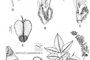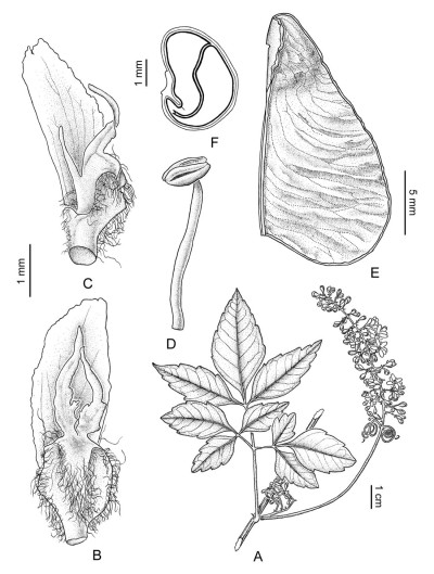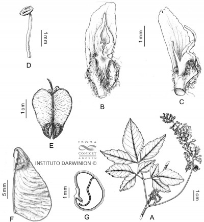 Trepadoras glabriúsculas o pubescentes, tricomas simples, breves y erectos en tallos, hojas y ejes de la inflorescencia; tallos con 8-10 costillas notables, a veces fistuloso; cámbium único. Hojas con estípulas triangulares, de 1,75-3 mm de largo, ciliadas, persistentes; pecíolo de 2,7-7 cm de largo, canaliculado; lámina 2-yugada, par basal con 3 foliólulos; raquis primario y ráquises secundarios 2-canaliculados, a veces marginados, pubérulos; peciólulo nulo o hasta de 16 mm de largo; folíolo terminal ovado-angosto u ovado, los laterales ovados o elípticos, 1,5-11,5 × 2-4,5 cm, cartáceos, discoloros, ciliados; base decurrente en folíolo y foliólulos terminales, cuneada en los demás, ápice agudo u obtuso mucronado, margen dentado-serrado; cara adaxial glabra, pubérula sólo sobre las venas principales o pubescente, cara abaxial glabra, a veces axilas barbadas, o pubescente. Inflorescencias en tirsos con ejes glabros, pubérulos o pubescentes; pedúnculo del cincino de 1-3 mm de largo; pedicelo del fruto ca. 4 mm de largo, articulado en la base o en la mitad; brácteas ca. 2 mm de largo, pubérulas. Flores de 4,5-6 mm de largo; sépalos externos de 1,5-2,5 mm de largo, los internos ca. 3,5 mm de largo; glabros, margen con tricomas glandulares; pétalos ca. 4,5 mm de largo, glandulosos en la cara interna, escama con cresta 2-corniculiforme en los pétalos posteriores; lobos nectaríferos posteriores de contorno circular, los anteriores conformes, menores, glabros; androginóforo glabro; estambres de la flor estaminada de 4-5 mm de largo, filamentos glabros o pubérulos, en la flor pistilada ca. 1,75 mm de largo; pistilodio glabro; gineceo ca. 3,75 mm de largo, con tricomas glandulares en el ovario, estilo más corto que las ramas del estigma. Frutos esquizocarpos ovoideo-cordados, de 1,7-2,7 × 1,6-2,5 cm, a nivel de los lóculos de 0,6-0,9 cm de ancho, cartáceos, porción seminífera del mericarpo inflada, con venación notable, raro con cresta dorsal angosta, sin constricción debajo de la misma; epicarpo glabro, endocarpo glabro o con escasos tricomas. Semillas 3-gono-elipsoides, de 4-4,5 × 2,5-3,5 mm, insertas ca. de la mitad de los lóculos; embrión con ambos cotiledones subrectos.