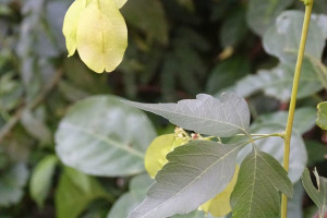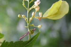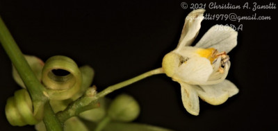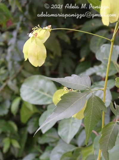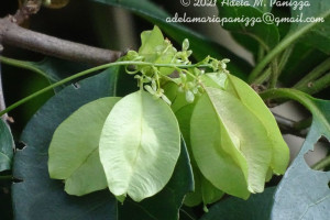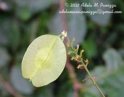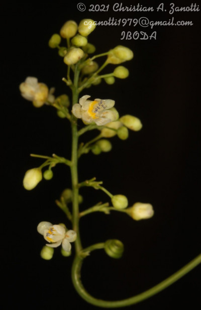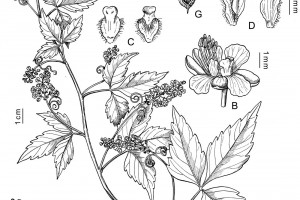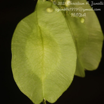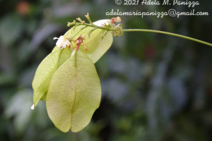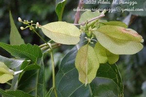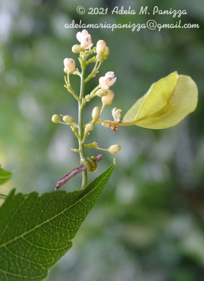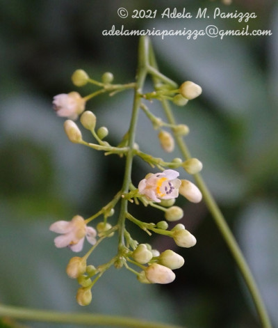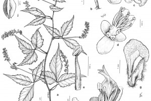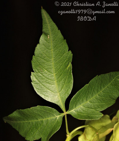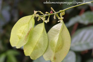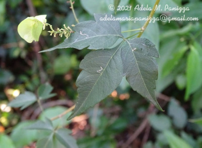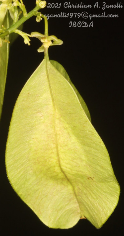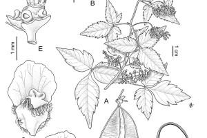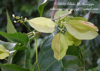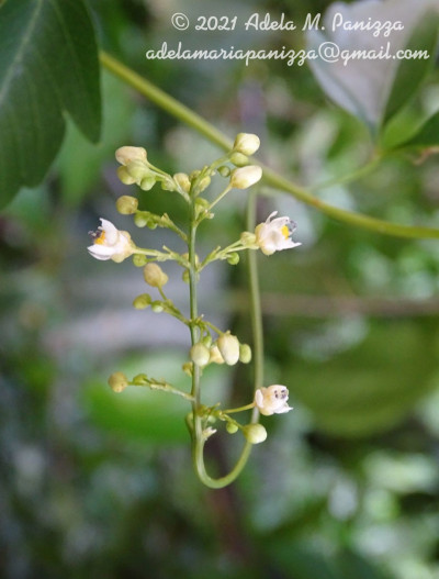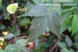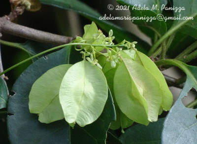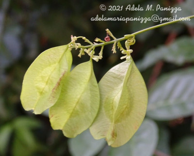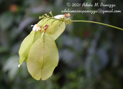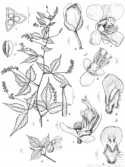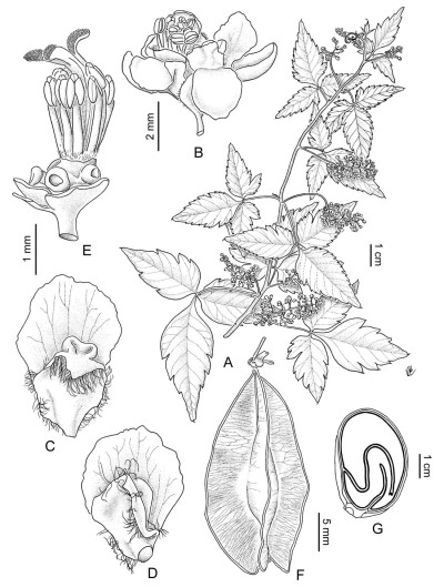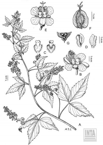 Trepadoras generalmente glabriúsculas, a veces pubescentes; indumento de densidad variable de tricomas simples, blanquecinos, breves y curvos, además de tricomas glandulares diminutos dispersos, en tallos jóvenes, pecíolos y ejes de inflorescencia; tallos jóvenes con costillas sobresalientes, luego subteretes, castaño-rojizos, ca. 3 mm de diámetro, con lenticelas. Hojas con estípulas triangulares, de 0,75-2 mm de largo, pubérulas o pubescentes, persistentes; pecíolo de 1-3,7 cm de largo; peciólulo marginado de 2-8(-14) mm de largo, notable en folíolo terminal, breve en los demás; folíolos generalmente ovado-angostos, raro ovados, de 3,8-8,3 × 1,7-3,7 cm, cartáceos, discoloros; base decurrente, a veces obtusa o redondeada en folíolos laterales, ápice atenuado o acuminado, raro obtuso, mucronado, ciliados; folíolo terminal dentado-serrado, con 1-8(-15) dientes, raro con 2(-4) incisiones o subentero, los laterales inciso-dentados, con una incisión basal en margen externo, que no supera 1/2 de semilámina, glándula apical en algunos dientes; caras adaxial y abaxial glabras, a excepción de venas principales pubérulas, o cara adaxial pubérula y cara abaxial pubescente, axilas generalmente barbadas. Inflorescencias en tirsos racemiformes; cincinos plurifloros, pedúnculo del cincino de 1-3,5 mm de largo, raro subsésiles, pedicelo ca. 2,5 mm de largo, en fruto ca. 3 mm de largo, articulado poco por encima de la base o en 1/3 basal; brácteas triangulares, ca. 1 mm de largo, ciliadas. Flores de 3,5-5,5 mm de largo; sépalos externos suborbiculares, de 1,5- 2,5 mm de largo, glabros o pubérulos en la cara externa; internos obovados, de 2-4 mm de largo, petaloideos, glabros, margen con diminutos tricomas glandulares y algunos tricomas simples en base de los sépalos internos; pétalos obovados, de 2,5-5 mm de largo, glandulosos en la cara interna, escama con la cresta emarginada o entera en los pétalos posteriores; lobos nectaríferos posteriores ovoide-obtusos, breves, los anteriores de contorno subelíptico, menores, glabros; androginóforo glabro, con un anillo piloso en zona de inserción de los estambres; estambres de la flor estaminada de 2-3 mm de largo, filamentos glabros, pubérulos o pubescentes, antera con expansión apical del conectivo, estambres de la flor pistilada de 1,5-2 mm de largo; pistilodio con escasos tricomas glandulares; gineceo de 2,5-3 mm de largo, ovario 3-gono-elipsoide, sólo piloso sobre vena dorsal de cada carpelo, estilo glabro o pubescente, estilo igual o mayor, a veces menor, que las ramas del estigma. Frutos cápsulas de contorno elíptico-suborbiculado, obovado-ancho o elíptico, de 2-3 × 1,2-2,5 cm, incluido estípite de 0,5-2(-3) mm de largo, cartáceas, castaño-claras, ápice profundamente exciso, lóculos inflados; cada lóculo de 11-17 × 3,5-5 mm; alas de 2,5-7 mm de ancho; epicarpo glabro o pubescente; endocarpo glabro. Semillas 3 maduras, elipsoides, de 4,5 × 2,7-3,5 mm, insertas por debajo