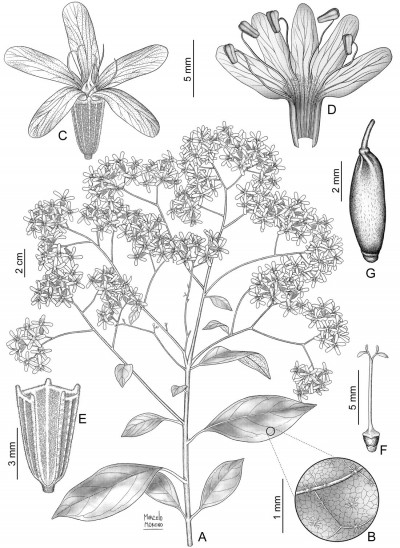 Árboles de 20-25 m de alto; tronco con corteza grisácea y rugosa; ramas con pubescencia de tricomas estrellados cuando jóvenes, glabrescentes a la madurez, con presencia de domacios. Hojas caducas con pecíolos de (0,5-)0,8-2,8(-3,5) cm de largo, en ocasiones canaliculados en la superficie adaxial, pubescentes, con tricomas estrellados; lámina elíptica o ligeramente obovada, de (3,5-)5-17(-20,5) × (1,4-)2-7(-8,5) cm, membranácea, superficie adaxial glabra o glabrescente, con tricomas estrellados, superficie abaxial ligera a densamente estrigosa, con tricomas estrellados, ápice acuminado o agudo, base aguda u obtusa, el margen entero. Inflorescencias formadas por cimas paniculadas terminales, generalmente bracteadas en las ramificaciones de primer orden. Flores pediceladas con cáliz tubular, de 4-5,5(-6,5) mm de largo, notoriamente acanalado, pubérulo, con tricomas estrellados, dientes triangulares, breves, de ápice obtuso; corola 5-mera, hipocrateriforme, blanca, con el tubo de (3,5-)4,5-6(-8,5) mm de largo, limbo de 8-9 mm de diámetro, lóbulos oblongos; estambres 5, anteras de contorno oblongo, de 1,5-2(-2,5) mm de largo; ovario ovoideo, hasta de 2 mm de largo, estilo 2-partido con 4 estigmas obovados. Fruto elipsoidal, castaño a la madurez, 1-seminado, totalmente cubierto por el cáliz fructífero y la corola persistente.