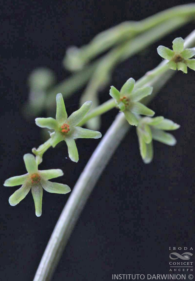Hierba trepadora, monoica, glabrescente. Tubérculo irregular de 10 a 20 cm diám. con brote vegetativo central, pardo a marrón oscuro, con crecimiento horizontal, cubierto de múltiples rizóforos de diferentes longitudes. Tallos aéreos verdosos ocasionalmente con tintes rojizos, levovolubles, ca. 1-3 mm de diám., estriados, con canales profundos, glabrescentes. Hojas hasta 17 cm long.; pecíolos de 2-5 cm long.; láminas de 4-12 x 4-10 cm, suborbiculares o a veces triangular- ovadas, membranáceas, 7-9 nervias, los de los extremos bifurcados, ápice agudo, mucronado, base cordada o raro truncada, seno basal amplio, cóncavo, separando dos lóbulos basales redondeados, envés con glándulas circulares esparcidas próximas al pecíolo, en material disecado se presentan como pequeños puntos negros. Inflorescencias estaminadas en racimos simples, ca. 15 cm long., 1-4 racimos por axila y de hasta 40 flores; bracteolas externas ovadas, las internas lineares; flores solitarias, con pedúnculo de 2-5 mm long.; perianto amarillo verdoso 4-5 mm diám., tépalos libres, patentes, elípticos con ápice agudo u obtuso, 3 nervados; androceo con 6 estambres, filamentos con glándulas amarillentas a ambos lados de su tercio inferior, libres o apenas unidos por la base, y entonces, insertos en una glándula carnosa discoidal; anteras introrsas, subiguales, 3 oblongas y 3 suborbiculares, rudimento estilar con tres ramas estigmáticas, en ocasiones presente. Inflorescencia femenina en espiga, ca. 10 cm long., 1-2 por nudo y de hasta 20 flores; bracteolas de diferentes formas y tamaños; flores sésiles, alternas, de 2,5-3 mm diám.; perianto patente, tépalos verdosos, lanceolados, uninervados; ovario de hasta 3 mm long. con 3 ramas estigmáticas rodeadas a veces por una base glandular. Cápsulas de 1,6-1,8 x 0,8-1,0 cm, trialadas, obovadas, elípticas a oblongas, pardas. Semillas elípticas u oblongas, de aproximadamente 3-5 mm long., con un ala membranosa posterior de 2-3 mm long.