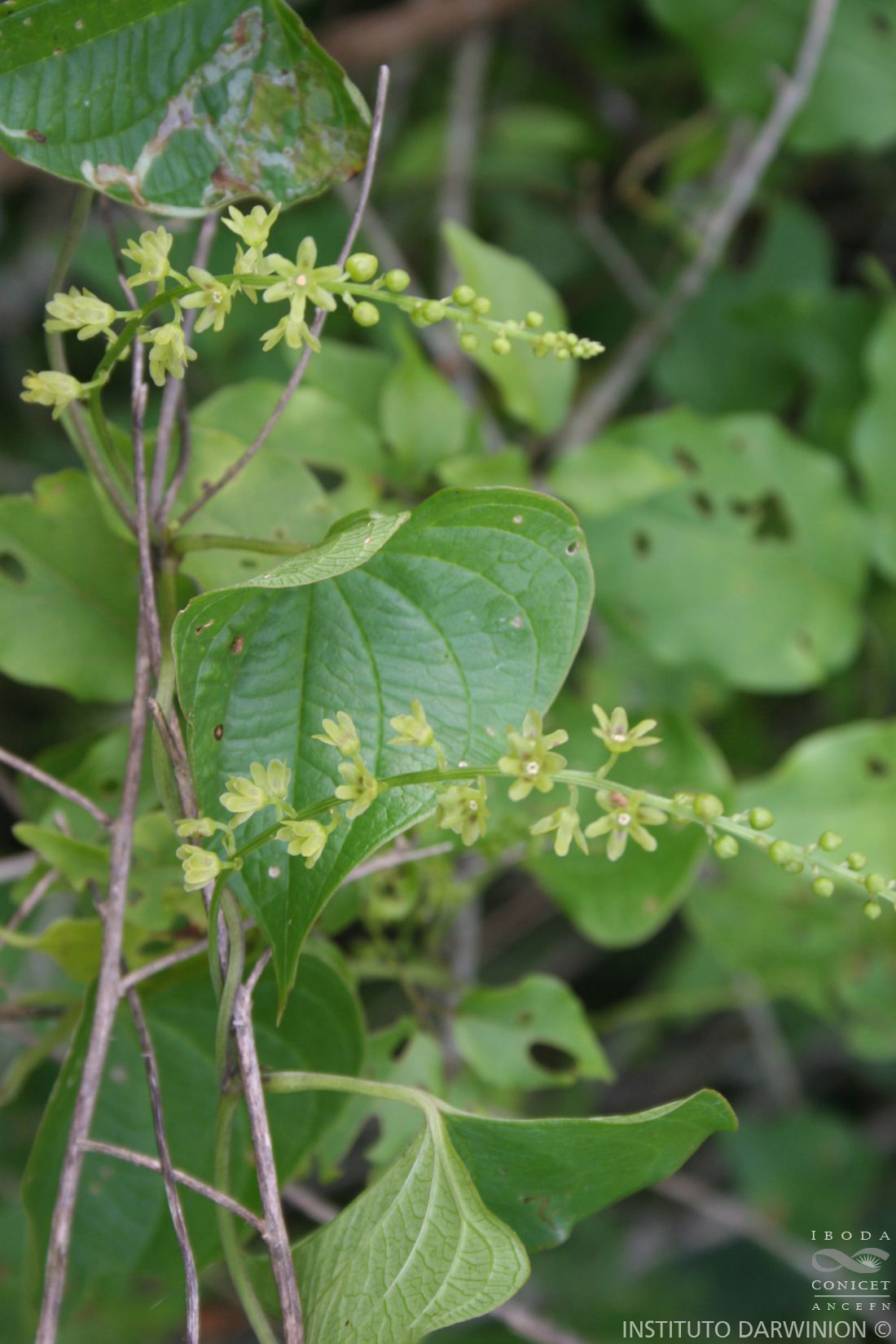 Hierba trepadora, monoica, glabrescente. Tubérculo irregular de 10 a 20 cm diám. con brote vegetativo central, pardo a marrón oscuro, con crecimiento horizontal, cubierto de múltiples rizóforos de diferentes longitudes. Tallos aéreos verdosos ocasionalmente con tintes rojizos, levovolubles, ca. 1-3 mm de diám., estriados, con canales profundos, glabrescentes. Hojas hasta 17 cm long.; pecíolos de 2-5 cm long.; láminas de 4-12 x 4-10 cm, suborbiculares o a veces triangular- ovadas, membranáceas, 7-9 nervias, los de los extremos bifurcados, ápice agudo, mucronado, base cordada o raro truncada, seno basal amplio, cóncavo, separando dos lóbulos basales redondeados, envés con glándulas circulares esparcidas próximas al pecíolo, en material disecado se presentan como pequeños puntos negros. Inflorescencias estaminadas en racimos simples, ca. 15 cm long., 1-4 racimos por axila y de hasta 40 flores; bracteolas externas ovadas, las internas lineares; flores solitarias, con pedúnculo de 2-5 mm long.; perianto amarillo verdoso 4-5 mm diám., tépalos libres, patentes, elípticos con ápice agudo u obtuso, 3 nervados; androceo con 6 estambres, filamentos con glándulas amarillentas a ambos lados de su tercio inferior, libres o apenas unidos por la base, y entonces, insertos en una glándula carnosa discoidal; anteras introrsas, subiguales, 3 oblongas y 3 suborbiculares, rudimento estilar con tres ramas estigmáticas, en ocasiones presente. Inflorescencia femenina en espiga, ca. 10 cm long., 1-2 por nudo y de hasta 20 flores; bracteolas de diferentes formas y tamaños; flores sésiles, alternas, de 2,5-3 mm diám.; perianto patente, tépalos verdosos, lanceolados, uninervados; ovario de hasta 3 mm long. con 3 ramas estigmáticas rodeadas a veces por una base glandular. Cápsulas de 1,6-1,8 x 0,8-1,0 cm, trialadas, obovadas, elípticas a oblongas, pardas. Semillas elípticas u oblongas, de aproximadamente 3-5 mm long., con un ala membranosa posterior de 2-3 mm long.