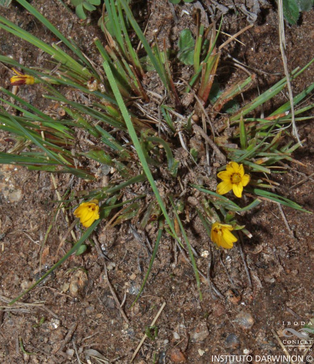 Plantas perennes de 9-30 cm de altura. Rizoma corto con raíces fasciculadas carnoso-fibrosas. Hojas basales numerosas, lineares, de 7-15 × 0,7-2,5 mm, bordes ásperos con de cilios diminutos. Tallos florales varios alado-ancipitados, con frecuencia geniculados, con 1-2 hojas ± reducidas y brácteas. Espatas multifloras, de 5 a muchas inflorescencias, de 7-13 mm de largo; brácteas casi iguales, de bordes escarioso-membranosos. Flores de 10-12 mm de diámetro, ampliamente infudibuliformes hasta rotáceas, escarioso-membranosos, amarillas, con una zona parda hacia el centro. Tépalos oblanceolados, los exteriores de 12 × 3,2 mm, los interiores del mismo largo y algo más angostos, ambas series con apículo. Columna estaminal alargada, de 2,5 mm de largo, densamente cubierta hacia la base por elaióforos amarillos. Anteras contiguas de 0,7-0,8 mm de largo. Ovario obovoide, glanduloso-piloso, de 1,2 × 0,8 mm. Ramas del estilo muy pequeñas, soldadas entre sí en parte. Cápsulas irregulares, con frecuencia obovoides o casi globosas, 2,4-4 mm de largo. Semillas negras, diminutas.