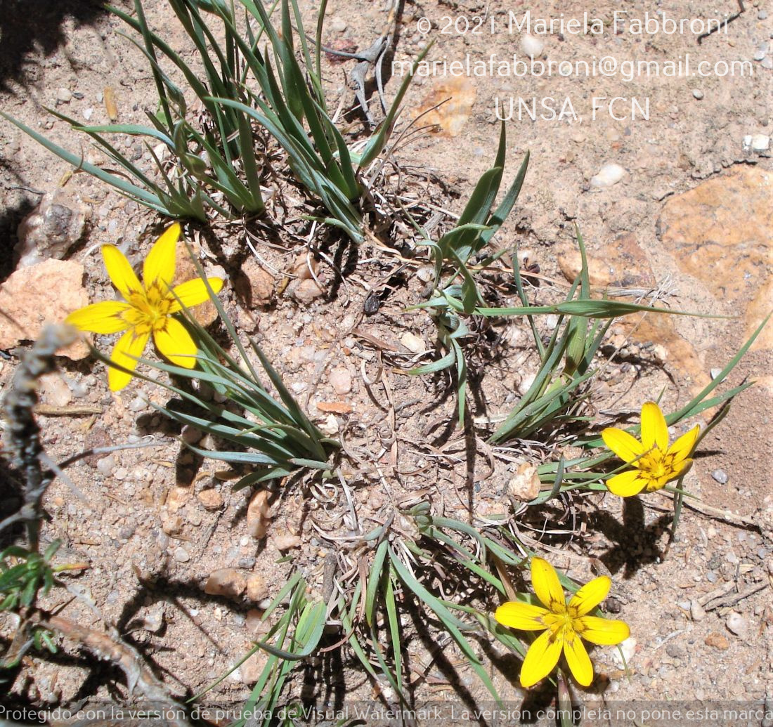 Plantas perennes de 9-30 cm de altura. Rizoma corto con raíces fasciculadas carnoso-fibrosas. Hojas basales numerosas, lineares, de 7-15 × 0,7-2,5 mm, bordes ásperos con de cilios diminutos. Tallos florales varios alado-ancipitados, con frecuencia geniculados, con 1-2 hojas ± reducidas y brácteas. Espatas multifloras, de 5 a muchas inflorescencias, de 7-13 mm de largo; brácteas casi iguales, de bordes escarioso-membranosos. Flores de 10-12 mm de diámetro, ampliamente infudibuliformes hasta rotáceas, escarioso-membranosos, amarillas, con una zona parda hacia el centro. Tépalos oblanceolados, los exteriores de 12 × 3,2 mm, los interiores del mismo largo y algo más angostos, ambas series con apículo. Columna estaminal alargada, de 2,5 mm de largo, densamente cubierta hacia la base por elaióforos amarillos. Anteras contiguas de 0,7-0,8 mm de largo. Ovario obovoide, glanduloso-piloso, de 1,2 × 0,8 mm. Ramas del estilo muy pequeñas, soldadas entre sí en parte. Cápsulas irregulares, con frecuencia obovoides o casi globosas, 2,4-4 mm de largo. Semillas negras, diminutas.