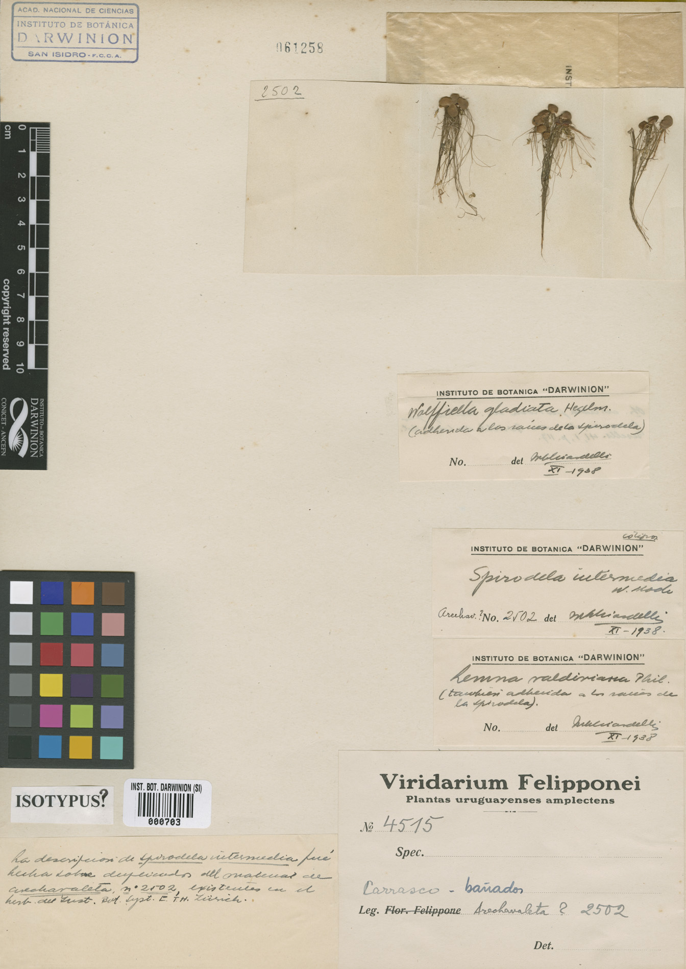 Frondes flotantes 4-7.5 × 3-6 mm, hasta 3 mm de espesor, ápice obtuso, nervadura poco visible, de 7-12 nervios, cuerpo de la fronde con lagunas aerenquimáticas amplias y superpuestas en número de 3 ó 4 en la parte media disminuyendo en número y tamaño hacia los bordes. Raíces fasciculadas, 2-3 cm de largo, recorridas por un hacecillo, piloriza aguda, derecha o un poco arqueada, ± 1,5 mm de largo Las 2-5 primeras raíces perforan la hoja rudimentaria ventral, hasta 20 raíces más jóvenes crecen libres detrás de esta hoja rudimentaria. Células pigmentadas muy abundantes en el parénquima, sobre todo en los estratos subepidérmicos, en las raíces, en la pilorriza y, en algunas veces, también en el profilo dorsal. La inflorescencia nace en el bolsillo del lado menos desarrollado de la fronde. Espata delgada, membranácea, en forma de bolsa ± esférica, abierta en la parte superior por hendedura estrecha. Flor estaminada: estambre de filamento hasta 2 mm de largo antera 0,5 × 0,35 mm, tecas alargadas, rimosas. Granos de polen espinulosos, globosos a ovoides, de 20 µ en su mayor diámetro; pistilo comprimido dorsiventralmente, con bordes laterales alados, con prominencia roma o costilla a lo largo de la línea media en la cara ventral, 1,5-2,55 × 0,9-1,85mm y ± 1mm de espesor; estigma circular, el estilo no bien diferenciado se continúa insensiblemente con el ovario, 4-5 óvulos anátropos. Fruto grande, asimétrico, 2,3-2,75 × 1,2- 2,1 mm, sobresale considerablemente del borde de la fronde, 2,3-2,75 mm × 1,2 mm, estilo corto, persistente. Semillas 1-5, estriadas longitudinalmente; cuando por excepción hay una sola semilla, esta es muy grande y horizontal, cuando hay varias, son más chicas y erguidas. Células pigmentadas en toda la flor joven, aumentando a medida que se desarrolla y madura el fruto que aparece así de color castaño oscuro. Un resto de espata persistente muy pigmentada permanece adherida a la cara ventral del fruto. Células con ráfides en toda la inflorescencia y en el fruto; en la espata numerosísimas células con drusas. Floración protogina, el estilo sobresale de la espata, se encorva, y el estigma emerge de la superficie del agua, después sucesivamente los dos estambres. Cromosomas 2n = 20, 30.