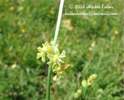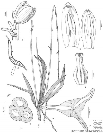Hierba acaule, inerme, 0,30-1 m altura, hojas basales arrosetadas, linear-lanceoladas, borde liso, sin estiloides, 17-23-nervadas, 4,5-14 cm × 4-10 mm, rara vez 1 roseta foliar sobre el eje floral. Inflorescencia terminal, sobre eje bracteado, simple, ocasionalmente voluble hacia el ápice; fascículos 2-5 flores, brácteas triangulares a rómbico-deltoides, 1-5 nervias, 1,7-8 mm de largo; pedicelos 2-5 mm de largo, articulados en la base de la flor; tépalos apenas concrescentes en la base, carnosos, amarillo-verdosos, 3-4 nervados, oblongos, ligeramente cuculados, con papilas subapicales, los exteriores de 4-4,8 × 1,5-2 mm, los interiores 3,5 × 1,5-1,8 mm ; anteras subemarginadas, 1,5-2,2 mm de largo; gineceo 3 mm de largo, ovario globoso, óvulos 5-6 por lóculo. Cápsula oblonga, 11-15 × 8-9 mm, trialada; semillas 3-4 por lóculo, 7 × 4 mm, aladas.