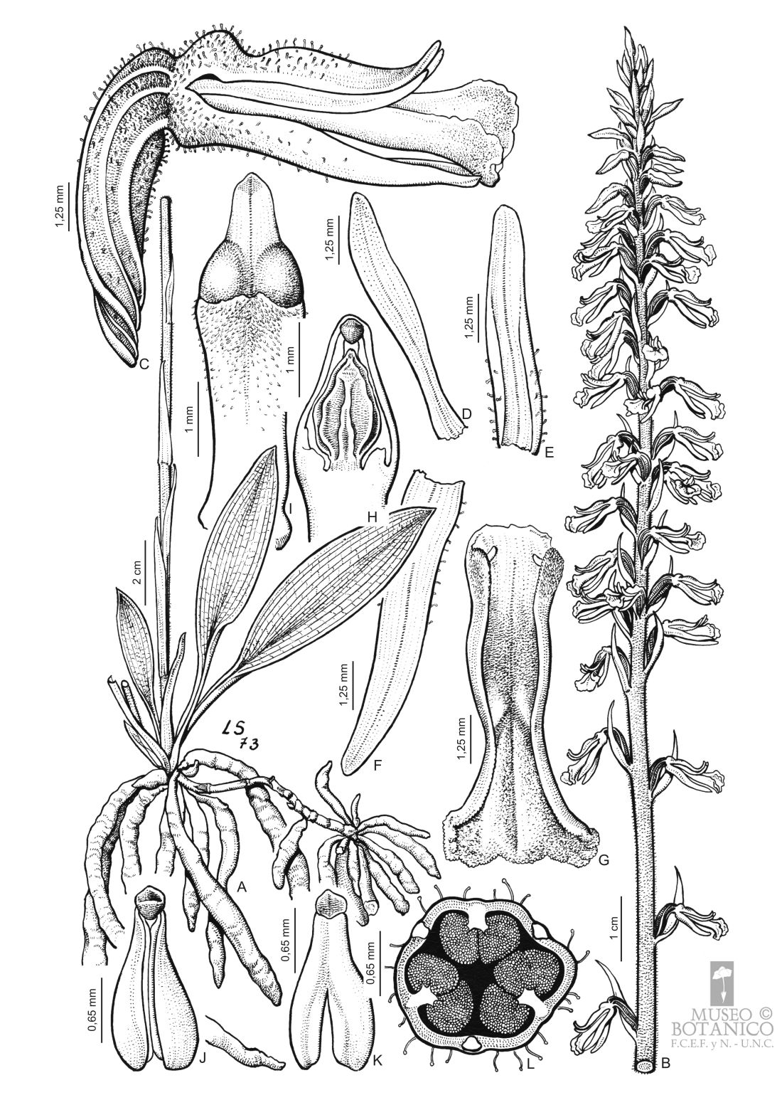 A. Planta. B. Inflorescencia. C. Flor, vista lateral. D. Pétalo lateral. E-F. Sépalos dorsal y lateral, respect. G. Labelo. H-I. Columna, vista del lado de la antera y del estigma, respect. J-K. Polinia, vistas adaxial y abaxial, respect. L. Transcorte por ovario.