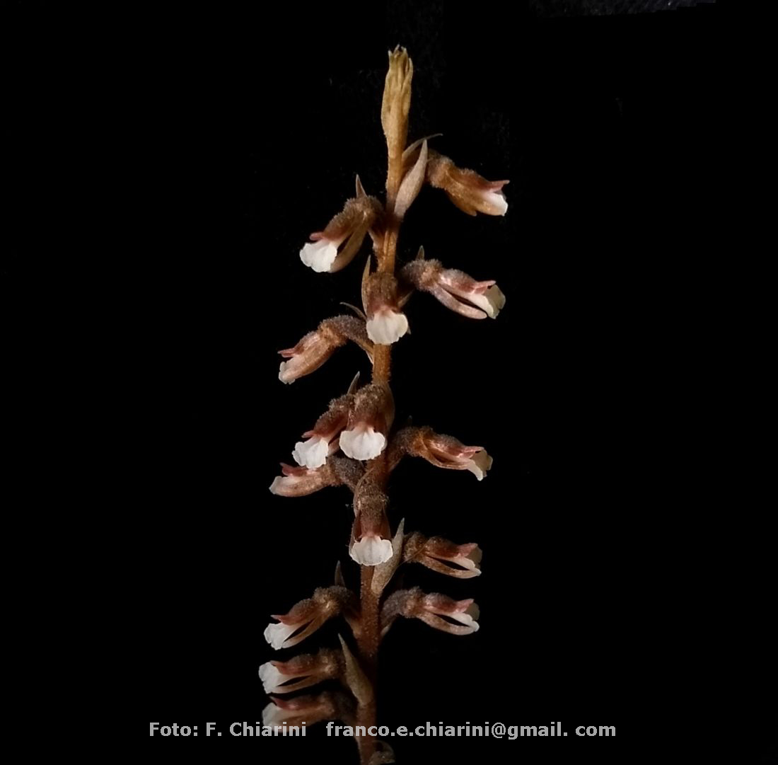 Herbácea de 20-60 cm alt., erecta. Hojas 8,5-13 × 1,5-3,5 cm, oblongo-elípticas a ovado-elípticas, seudopecíolo igual o poco más corto que la lámina, ensanchado en la base rodeando el tallo. Escapo glabro con 4-6 hojas caulinares, espaciadas, adpresas. Inflorescencia laxa, generalmente pluriflora, de flores poco vistosas, verdosas hasta pardo-rojizas, patentes a nutantes. Brácteas agudas más largas que el ovario. Sépalo dorsal 6-9 × 1-2,5 mm, acuminado, cóncavo en la base, los laterales 6-10 × 2-3 mm, obtusos, algo ensanchados en la base, 1-nervios. Pétalos linear-espatulados, 1-nervios, 1 mm de ancho y más cortos que el sépalo dorsal. Labelo 7-11 × 3-5 mm, en la base y en el ápice blanco, abruptamente contraído en la mitad superior, expandiéndose hacia el ápice en una lámina ancha transversalmente ovada, generalmente más ancha que la base, con borde finamente ondulado. Columna 3-4 mm de largo, cortamente pubescentes en la cara ventral; rostelo 0,3-0,4 mm de ancho.
