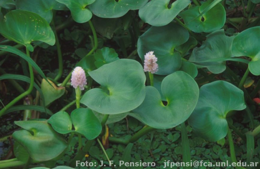 Plantas anuales o perennes, flotantes o semisumergidas. Tallos flotantes, horizontales, cilíndricos, hasta 3 m de largo, purpúreos. Hojas dísticas, pecioladas, pecíolo de 18-20(40) cm de largo, con la parte inferior algo ensanchada; lámina orbicular o reniforme, más ancha que larga, de 4-9(12) × 7-10(20) cm, truncadas a cordadas en la base; vaina basal membranácea, purpúrea, de 6-7 cm de largo, prolongada en una lígula hialina. Inflorescencia espiciforme, hasta con 40 flores, espata glabra, verdosa, 2-4 cm de largo, soldada en la mitad inferior a abierta hasta la base, acuminada, borde superior reflejo, raquis con la parte basal desprovista de flores, porción que queda cubierta por la espata. Flores liláceas o blancuzcas, 15-20 mm de largo. Perigonio corolino infundibuliforme, 2-labiado, tubo fuertemente surcado, rara vez fenestrado, lóbulos internos ovales u obovales, el mediano con una mancha amarilla, lóbulos externos lanceolados, el inferior más angosta; raquis y tubo perigonial con pelitos glandulares uniseriados. Estambres 6, 3 inferiores más largos y arqueados hacia arrriba, los otros 3 más breves incluídos en el tubo perigonial; anteras azuladas. Gineceo heterostilo, ovario fusiforme, glabro, estilo con pelos papilosos en la mitad superior. Angiocarpo pedunculado, alargado, 4 × 7 mm, con costillas espinulosas que le dan aspecto erizado, apiculado. Aquenio maduro sumergido. Semilla ovoide, lisa, castaño claro, 3-4 mm de largo.