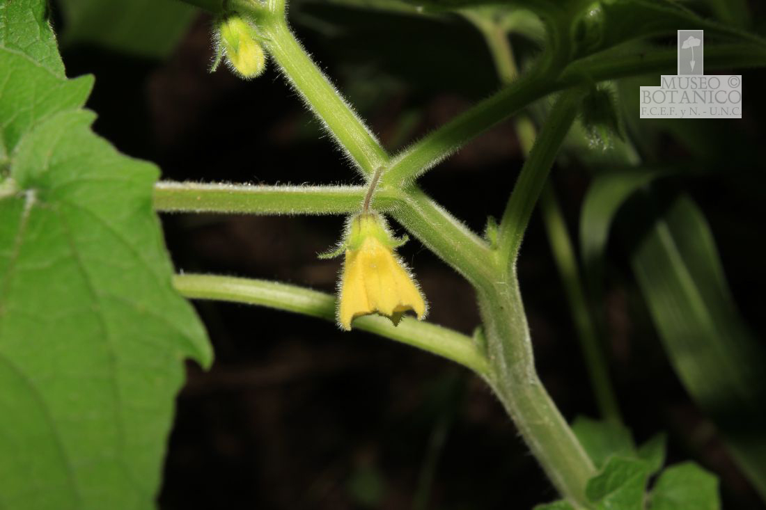 Hierbas anuales, de (8-)10-100 cm de alto; tallos glandulosopubescentes, pegajosos al tacto, con tricomas largos, hasta de 2 mm. Pecíolos de 1,5-7 cm, con tricomas simples, glandulares; láminas anchamente ovadas a subcirculares, de 3-10 × 2-6,5 cm, lobadas a dentadas con 2-8 dientes por lado, con tricomas eglandulares de 150-400 µm, otros tricomas glandulares breves (de 40-70 µm), de cabezuela pluricelular y otros más largos (de 150 a 700 µm) con cabezuela 1-celular. Pedicelo curvo de 4-10(-12) mm; cáliz de 2,5-5 mm, lóbulos de 1-3 mm, divididos hasta 1/2 -2/3 de la longitud del cáliz, con abundantes tricomas glandulares largos, a veces ramificados (cabezuela 1-celular) entremezclados con otros glandulares cortos (cabezuela pluricelular); corola de 6-10,5 × 4-14 mm, amarilla, con 5 manchas violeta oscuro o con máculas pardas poco contrastantes, con tricomas largos, eglandulares y glandulares ramificados, en el borde superior del tubo; estambres de 2,5-6 mm, anteras azules de 1,5-2,5 mm, filamentos con pelos glandulares, petalostemos pubescentes; gineceo de 4,5-6,5 mm, ovario de 1-1,5 mm, estilo y estigma de 3,5- 5 mm. Baya de 0,5-1 cm de diámetro; pedicelos fructíferos de 8-17 mm; cáliz fructífero de 1,5-3,5 × 1,5-2,8 cm, 5-costado, con tricomas glandulares y eglandulares largos.