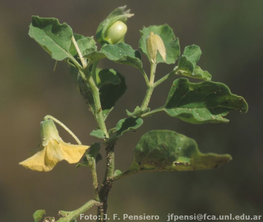 Hierbas perennes de 10-70 cm de alto, con raíces gemíferas; tallos ascendentes con tricomas simples, ramificados, glandulares, de 100 a 1200 µm. Pecíolos de 10-32 mm; láminas ovadas de 25-65 × 20-45 mm. Flores péndulas, pedicelos de (6-)9-20 mm; cáliz verde de 5-9 × 5-7 mm, lóbulos triangulares, de 2-4 mm; corola amarilla, rotáceo-acampanada, de 8-16 mm de diámetro, con 5 manchas verdoso-amarillentas en la garganta, internamente, por debajo de las manchas con abundantes tricomas ramificados y simples, blancos y lanosos, en la cara externa con tricomas eglandulares, glandulares y ramificados glandulares, abundantes a lo largo de los nervios de los lóbulos desde las manchas hacia el ápice; estambres de 6-10 mm, anteras amarillas de 2,5-3,8 mm, y filamentos de 3-6 mm; gineceo de 8-12 mm. Baya péndula, de 9-15 mm de diámetro, anaranjada, glabra, dulce; pedicelos fructíferos curvos, de 13-20 mm; cáliz fructífero de 18- 30 mm de largo × 12-20 mm de diámetro, 10-costado.