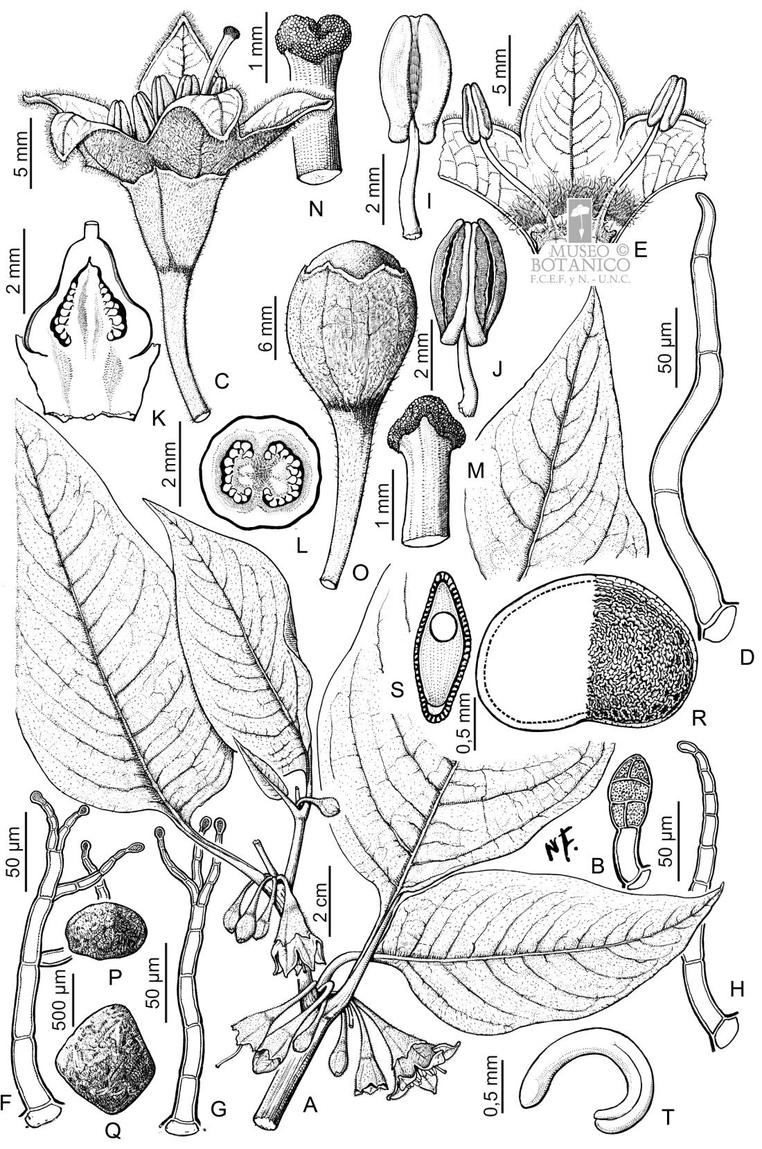 A. Sector de rama florífera. B. Tricoma glandular de cáliz y hoja. C. Flor. D. Tricoma eglandular del cáliz. E. Sector de corola desplegada. F-H. Tricomas del interior de la corola (F-G, glandulares; H, eglandular). I. Estambre, vista dorsal. J. Estambre, vista ventral. K. Ovario, corte longitudinal. L. Ovario, corte transversal. M-N. Estigma, dos vistas. O. Fruto. P-Q. Esclerosomas del pericarpo. R. Semilla. S. Semilla, corte transversal. T. Embrión.