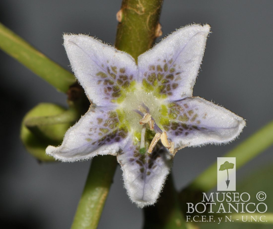 Árboles hasta de 7 m de alto y 20-40 cm de diámetro, ritidoma muy peculiar con emergencias angulares. Pecíolos pubescentes, de (2-)2,8-4(-5,7) cm; láminas ovadas o anchamente ovadas, de (6,5-)7-25 × 3-11(-13,5) cm, glabrescentes en el epifilo y muy tomentosas en el hipofilo, con tricomas eglandulares 2-5-celulares y tricomas glandulares de cabezuela pluricelular (8-20 células) y pie 2-celular, o de cabezuela 1-celular y pie 3-4-celular. Inflorescencias 6-8-floras. Flores péndulas, muy vistosas; pedicelos pubescentes, de 1,5-2,7 cm; cáliz campanulado, de 5- 5,5 mm, pubescente, con 5 apículos; corola rotácea, blanca, por dentro con manchas pardo-verdosas, lilacinas en la base de los lóbulos y limbo y centro amarillo-verdoso, por excepción íntegramente blanca, de 16-28 mm, tubo de 13-15 mm, apenas más largo que los lóbulos; éstos de 9-14 × 7-14 mm; por fuera densamente pubescente, por dentro con un denso anillo de tricomas ramificados y simples, ca. 3 mm ancho, por encima de la inserción de los filamentos; filamentos glabros, de (8-)10-13 mm, soldados a 2-2,2 mm de la base del tubo corolino, petalostemos notables, pilosos, anteras de 2,5-3,7(-4,7) mm. Baya subesférica, amarilla, de 9-11 mm de diámetro, pericarpo con abundantes esclerosomas; pedicelos fructíferos péndulos; cáliz acrescente hasta de 11 mm, envolviendo total o parcialmente la baya y desgarrándose en su borde superior; semillas de 2-2,2 × 1,5-1,8 mm.