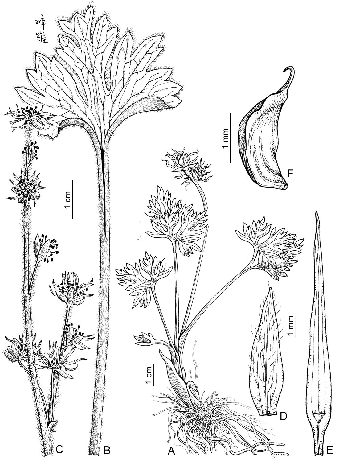 A. Planta. B. Sépalo. C. Aquenio.D. Inflorescencia estaminada. E. Hoja. F. Aquenio.