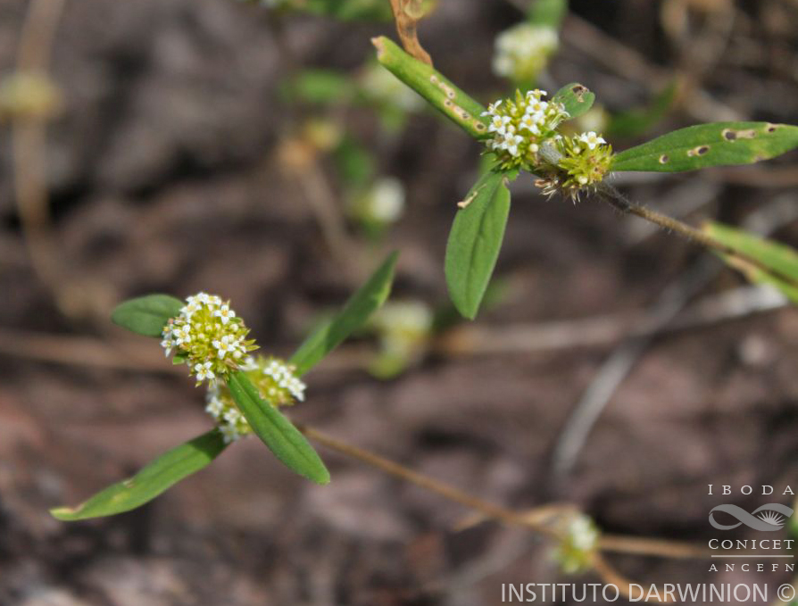 Hierba de 15-50(-70) cm de alto, erecta o decumbente; tallos simples o ramificados, cilíndricos o 4-gonos en los entrenudos apicales, pubescentes, fistulosos. Hojas sésiles; láminas elípticas, de 2,6-30 × 0,5-12,2 mm, ápice agudo, base atenuada en un pseudopecíolo corto, borde revoluto, escábridas, vilosas o glabrescentes; estípula de 2-3 mm de largo, pubescente, con 5-9(-11) fimbrias, pubescentes. Inflorescencias en glomérulos de 5-15 mm de diámetro, terminales y axilares, numerosos; brácteas 2-4. Flores con hipanto pubescente; cáliz 4-lobado, lóbulos mayores de 1,5-2 mm de largo, ciliados, los menores triangular-subulados, de 1-1,2 mm de largo; corola blanca, de 2-2,5(-5) mm de largo, externamente papilosa e internamente con un anillo de pelos ralos en la mitad inferior; estambres subsésiles, anteras apiculadas, de 0,4-0,5 mm de largo; estilo de 1,5-2,2 mm de largo, ramas estigmáticas de 0,3-0,5 mm de largo; disco entero. Fruto una cápsula subglobosa o subelipsoide, de 2-2,3 mm de largo, pubescente en la mitad superior, mitad inferior persistente, glabra o glabrescente. Semillas subelipsoides, de 0,6-10 mm de largo, retículo-foveadas, con fosita ventral + cruciforme, cubierta por el estrofíolo persistente.