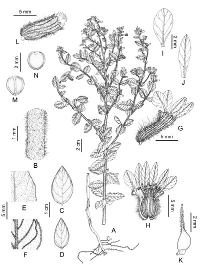 Hierba anual o sufrútice, de 15-60 cm de alto; tallos erectos, generalmente muy ramificados; rizoma delgado; entrenudos de 9-45 mm de largo, con tricomas glandulares de 0,5-1 mm de largo, acompañados con escasos tricomas estrigoso-adpresos. Hojas opuestas, subsésiles o con pecíolos de 1-10(-14) mm de largo, con tricomas similares a los del tallo; láminas anchamente ovadas, ovado-oblongas, ovado-lanceoladas o lanceoladas, de 1,2-4,5 × 0,7-2,5 cm, ápice agudo y base redondeada o cuneada, con tricomas estrigoso-adpresos acompañados de tricomas glandulares en ambas caras, a veces éstos últimos ausentes en la cara abaxial, margen escabroso y cortamente ciliado. Inflorescencia racimosa; brácteas ovadas a ovado-oblongas, de 6-25 × 2,3-10 mm, sésiles o subsésiles, con tricomas similares a los de las láminas foliares. Flores alternas, 1(-3) por nudo; pedicelos de 0,5-1,5 mm de largo, con tricomas similares a los de los tallos; bractéolas ovadas, de 0,2-0,7 × 0,2-0,6 mm de largo, glabrescentes o glabras; tubo floral de 7-10 × 1,5-2,5 mm; lóbulos deltoides, hasta de 1 × 2,5 mm; apéndices intersepalinos hasta de 0,7 mm de largo, con tricomas adpresos y setas glandulares purpúreas; superficie externa con tricomas glandulares, con o sin tricomas adpresos mezclados; pétalos dorsales obovados, los ventrales elíptico-oblongos o sublineares, de 3,2-8 × 1,1-2,5 mm, violáceos, persistentes en la postantesis e inflexos en el fruto; estambres insertos en el tercio superior del tubo calicino; ovario ovoideo-oblongo, de 2,5-3 × 1,5-2 mm, asimétrico, escasamente viloso en el ápice, con 5-9 óvulos; estilo hasta de 6 mm de largo, ± delgado, viloso, incluso, a veces subexerto; estigma capitado, subexerto en la postantesis; disco ascendente, de 0,7-1 × 0,7-0,9 mm, 3-lobado, cóncavo superiormente. Semillas 1-7 por cápsula, obcordadas a suborbiculares, de 2-2,5 × 1,8-2,5 mm, base truncada o redondeada, ápice redondeado o ligeramente retuso, margen discoloro, castaño-negruzcas