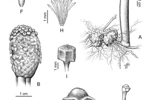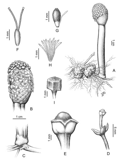 Plantas monoicas; tubérculos irregulares, de 20-35 × 20-30 mm, de no más de 20 mm de alto, con superficie verrugosa, castaño-claros; rizomas de 4-5 mm de diámetro, ramificados, castaño-claros. Estípite floral cilíndrico, hasta de 18 cm de alto × ca. 1,5 cm de diámetro, castaño-claro cuando jóvenes, castaño-oscuro cuando adulto; volva anular basal, de 2-5 mm de largo, formada por segmentos connados por sus bases y con los extremos triangulares irregulares. Inflorescencia ovoide, ca. 5-6 × 2,5-3 cm; brácteas ca. 5,5 × 2,5 mm; parafisos de |2-2,5 mm de largo, ensanchados en su extremo distal. Flores estaminadas ca. 9 mm de largo, exertas; tépalos oval-lanceolados, ca. 1,5 mm de largo, castaño-oscuros; filamentos estaminales soldados, ca. 3,5 mm de largo, con los extremos terminales libres, sinandro de 1-1,2 × ca. 1,2 mm. Flores pistiladas de 3,5-4 mm de largo, perigonio ausente; ovario ca. 1,8 × 0,3-0,5 mm, blanco, estilos 2, filiformes, de 1,5-2,4 mm de largo, rosados, estigmas más o menos esféricos, blanquecinos. Fruto un aquenio ca. 1,5 × 0,5 mm, con superficie granulosa, castaño-oscuro con el extremo basal castaño-claro.