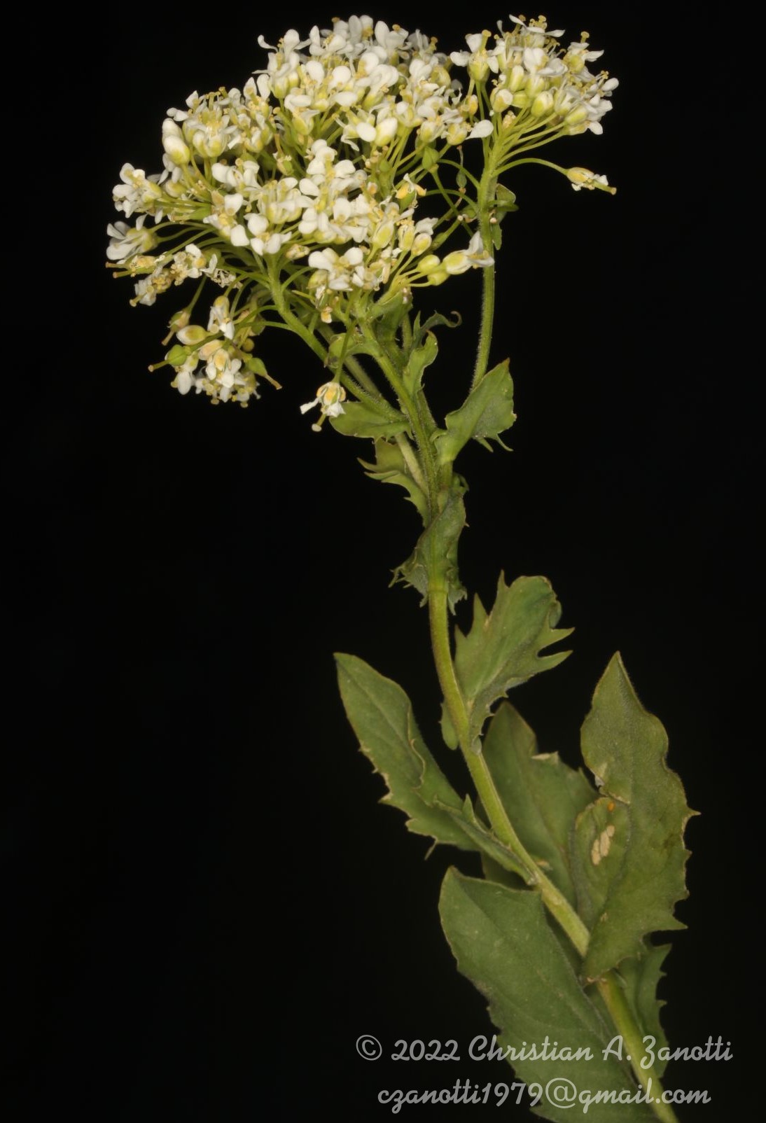 Hierbas perennes, rizomatosas, pubescentes, con tricomas usualmente simples y curvados, a veces glabras o glabrescentes al menos en la porción superior. Tallos de (0,8-)2-6,5(-9) cm de alto, erectos o decumbentes, profusamente ramificados en la porción superior. Hojas basales marchitas durante la antesis, pecioladas; láminas obovadas, espatuladas u ovadas, de (1,5-)3- 10(-15) × 1-4 cm, margen sinuado-dentado, ápice obtuso; hojas caulinares sésiles; láminas ovadas, elípticas, oblongas o lanceoladas, oblanceoladas u obovadas, de (1-)3-9(-15) × (0,5-)1- 2(-5) cm, pubescentes o glabras, la base sagitado-amplexicaule o auriculada, el ápice agudo o acuminado, margen dentado o entero. Racimos ligeramente alargados durante la fructificación; pedicelos fructíferos de 5-10(-15) mm de largo, divaricados o ascendentes, delgados. Sépalos oblongos, de 1,5-2,5 mm de largo, glabros, el margen blanco; pétalos blancos, obovados, de (2,5-)3-4(-4,5) × (1-)1,3-2(-2,2) mm, cortamente unguiculados, ápice redondeado; estambres 6; filamentos de 2-3 mm de largo; anteras ovoides, de 0,4-0,5 mm de largo. Frutos indehiscentes, ovoides o subglobosos, de (3,5-)4-6,2(-7) mm de diámetro, base redondeada, obtusa o truncada, ápice obtuso, sin escotadura apical; valvas ligera a fuertemente infladas, no carinadas, ligeramente reticuladas, glabras o cortamente pubescentes cuando ción; láminas obovado-lanceoladas, de-2,5-4 cm de largo, escasamente estrigulosas, margen serrado a dentado, ciliado; hojas caulinares inferiores de 2-4 cm × 3-7 mm, oblanceoladas, sésiles, auriculadas o no, subapicalmente 3-5-dentadas, glabras; hojas caulinares superiores lineares a linear-lanceoladas, subapicalmente 1-2-dentadas, glabras. Racimos laxos cuando maduros; raquis puberulento, con pelos retrorsos; pedicelos fructíferos arqueados, divaricados, ligeramente aplanados, de 3- 3,5 mm de largo, la cara adaxial puberulenta. Sépalos ovados, ca. 1 mm de largo, caducos, glabros o pubescentes, el margen blanco; pétalos blancos, filiformes, de 0,4-0,6 mm de largo; estambres 2, medianos; filamentos ca. 0,5 mm de largo; anteras de 0,2-0,3 mm de largo. Frutos dehiscentes, elipsoide-ovoides, de 3,5-4,2 × 2,4- 3 mm, glabros, lisos, estrechamente alados hacia el ápice, éste levemente emarginado, escotadura apical de 0,1-0,2 mm de largo; estilo muy breve, hasta de 0,1 mm de largo, inserto en la escotadura apical. Semillas castañas, ovoides, estrechamente aladas o marginadas, ca. 2 × 1,2 mm; cotiledones incumbentes. L