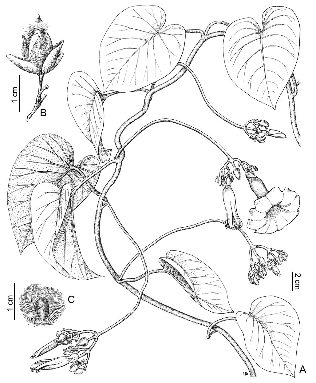 Plantas volubles o decumbentes, perennes, raíces tuberosas con engrosamientos subesféricos, enterrados en profundidad con profundidad, ramitas cilíndricas, surcadas, con pubescencia de pelos simples ondulados. Hojas enteras, ovadas a suborbiculares, obtusas o agudas, mucronadas, de base cordada, seno ancho con dos glándulas y aurículas redondeadas. Inflorescencia en cimas 3-20-floras, hasta cuatro veces ramificadas, pedúnculos gruesos, tomentosos; brácteas florales pubescentes, caducas; pedicelos tomentosos; botones obtusos, seríceos. Flores con sépalos externos elípticos u ovados, de ± 11 × 7 mm, subagudos, tomentosos, con glándulas en su base, los interiores ovados, de ± 8,5 × 7,5 mm, obtusos, tomentosos, bordes hialinos; corola serícea, infundibuliforme, rosada, de 4-10 cm de largo × 7-10 cm de diámetro, limbo 5-lobado, lóbulos emarginados, tubo y áreas mesopétalas seríceas; estambres de 27-29 mm de largo, los cortos de 2023 mm, bases cubiertas de abundantes pelos glandulares, de 20-29 mm de largo; ovario 2-locular, 4-ovulado, glabro o más raro con algunos pelos hirsutos en el ápice; estilo de 20 mm; estigma 2-globoso. Cápsula ovoidea ca. 11 mm, glabra, pardusca, con apículo de 3-4 mm, acompañada por los sépalos ampliados, valvas coriáceas. Semillas de ± 7 mm, pardorojizas, con pelos largos en los bordes.