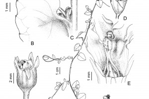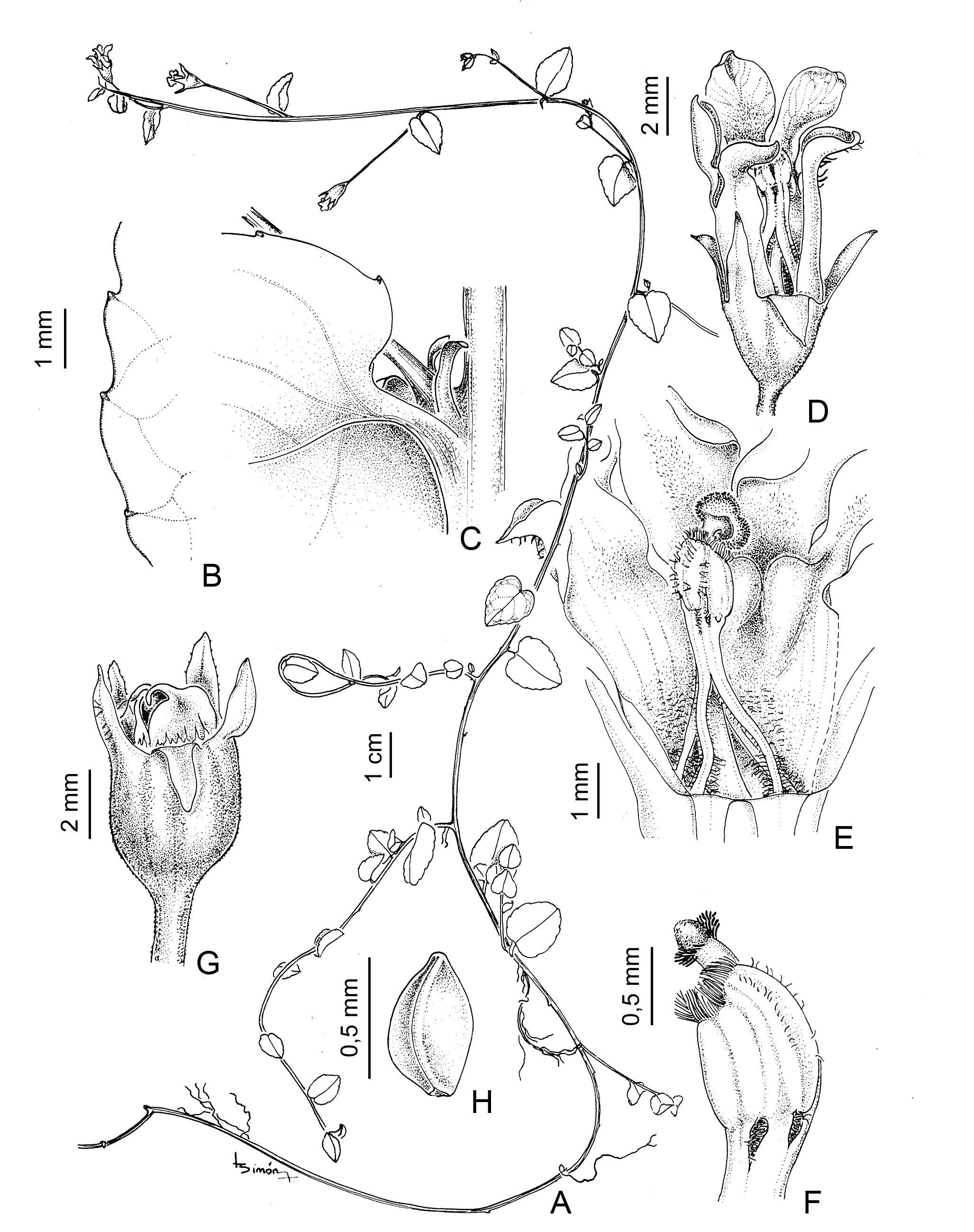 A. Planta. B. Hoja, detalle del margen. C. Detalle de bractéolas. D. Flor, vista dorsal. E. Flor con la corola desplegada, mostrando la giba en la base de los lóbulos, androceo y gineceo, con estigma receptivo. F. Porción superior del androceo y estigma inmaduro. G. Cápsula. H. Semilla. Tomado de Bonplandia (Corrientes) 9: 249, fig. 2. 1997.