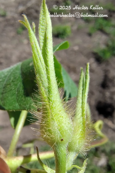 Hierba anual, con tallos volubles, a veces decumbentes, cilíndricos o angulosos, con pelos hirsutos retrorsos. Hojas trilobadas, pentalobadas y menos frecuentemente enteras, las pentalobadas con el lóbulo medio ovado, acuminado, contraído en la base y los laterales oblicuos, acuminados, base anchamente cordada, ambas caras con pubescencia adpresa variable. Inflorescencias cimosas 2-7-floras, con pedúnculos secundarios muy cortos, más raro flores solitarias. Flores con sépalos subiguales de 15-30 × 3-5 mm, los exteriores con porción inferior elíptica y la superior con un largo acumen linear a subespatulado, con abundantes pelos hirsutos de base ensanchada en la zona proximal, sépalos interiores lanceolados a lineares, con pelos dispuestos sólo en la línea media; corola infundibuliforme de 2-5 cm de largo, glabra, desde celeste hasta azul, con el tubo más claro; estambres de 12-45 mm de largo; ovario 3-locular, lóculos biovulados; estigma oscuramente 3-globoso. Cápsula globosa hasta de 15 mm de diámetro, con 3-6 semillas, rodeada por los sépalos que se amplían notablemente durante la maduración del fruto; tabiques delgados, hialinos, valvas 3. Semillas negras con pubescencia muy fina.
