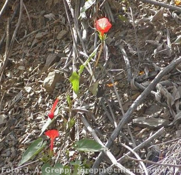 Enredaderas anuales; ramitas notablemente angulosas, estriadas, a veces muricadas, glabras. Hojas con pecíolo anguloso, subalado, a veces muricado, glabro; lámina glabra, ovada, entera, acorazonada, gruesamente dentada y más comunmente subtrilobada a trilobada, aguda a acuminada, mucronada, con el lóbulo medio elíptico a ovado-laceolado, a veces contraído en la base, agudo a acuminado, mucronado; lóbulos laterales semiovados, a veces gruesamente dentados, agudos; base cordada, seno ancho y poco profundo, con aurículas redondeadas hasta hastadas. Inflorescencia en cimas 3-20-floras, raro flores solitarias; pedúnculos angulosos con 4 alas angostas, muricados, glabros; pedicelos angulosos, lisos o muricados sobre los ángulos, glabros, el de la flor central generalmente más largo, erectos en la flor y en el fruto. Flores con sépalos exteriores oblongos, obtusos, de 3-5 × 1-2,5 mm, bordes hialinos, 1-3-carinados, muricados o lisos, glabros, con arista subterminal de 1,5-4 mm de largo, los interiores ovados, obtusos a subtruncados, carinados, glabros, lisos, con arista de 1-4 mm; corola roja o rojoanaranjada, de 2-3 cm de largo, subhipocraterimorfa, glabra, tubo cilíndrico, limbo campanulado; estambres exertos, los largos de 24-28 mm, los cortos de 20-28 mm; ovario 4-locular, 4-ovulado; disco anular; estilo de 20-22 mm. Cápsula subglobosa glabra de 6-7 mm de diám., 4-locular, tabiques hialinos. Semillas tomentosas, de ± 4 mm, pardo-ferrugíneas con moteado irregular más oscuro, con un surco longitudinal en su parte media dorsal y enangostadas en torno a la zona hilar, de modo que en vista dorsal se crea la apariencia de dos hombros laterales.