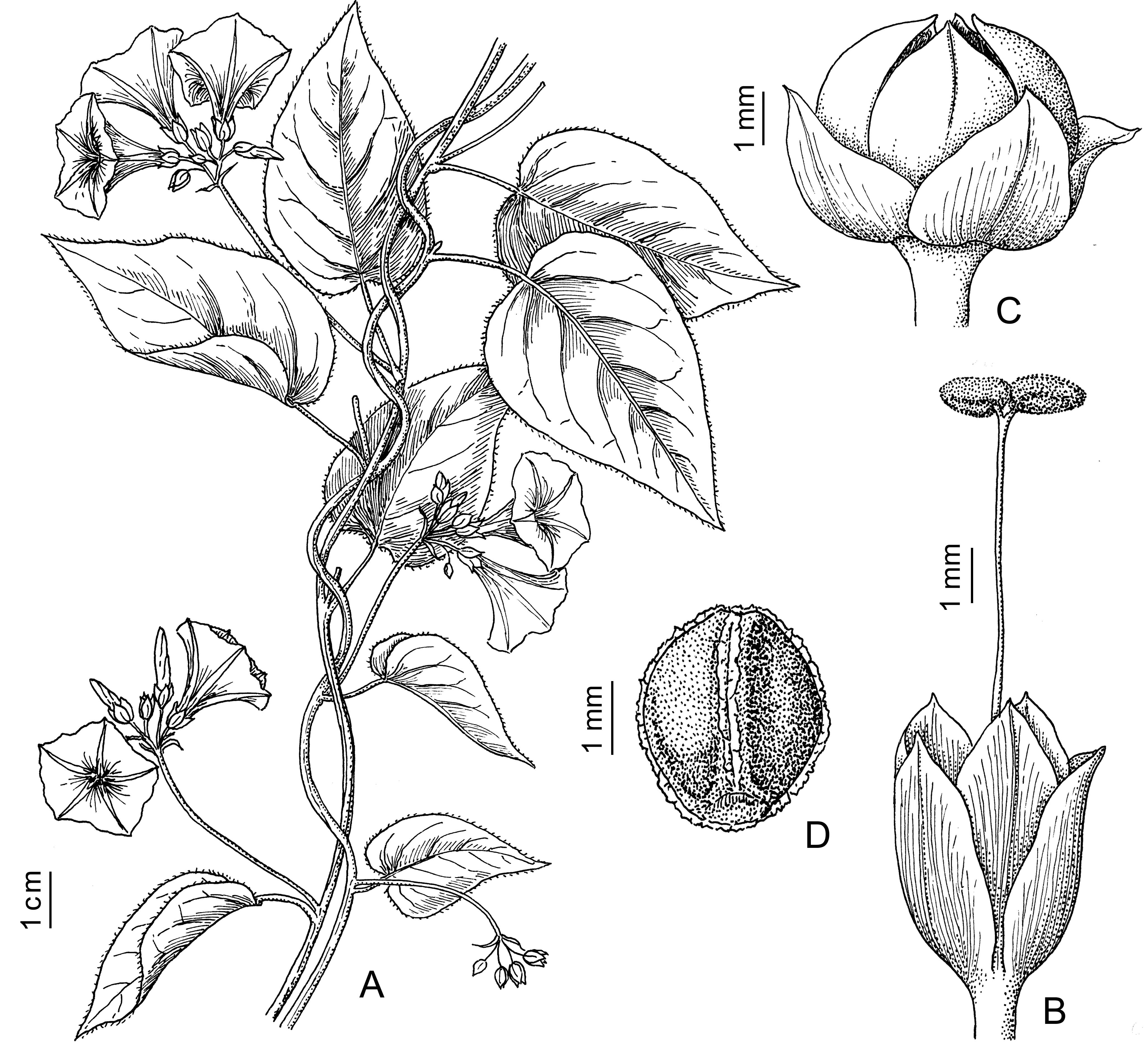 Enredaderas con ramas estriadas, de 1-2,5 mm de diámetro, glabras o algo pubescentes. Hojas con pecíolo de 12-70 mm y lámina ovada a ovado-elíptica, de 2-8 cm × 1-5 cm, enteras o con los bordes apenas sinuados, agudas o acuminadas, mucronadas; base cordada con seno ancho y poco profundo, subcordada o casi truncada o redondeada; glabras o con pelos divaricados o 3-radiados muy esparcidos en la base o sobre las nervaduras; pedúnculos de 3-11 cm de largo, glabros o pubescentes en la base; brácteas florales lanceoladas, de 3-4 mm de largo. Inflorescencia en cimas 320-floras, 2 ó 3 veces ramificadas, con pedúnculos secundarios muy cortos. Flores con sépalos exteriores elípticos, obtusos, ovados, subagudos, mucronulados, de ± 4,5 × 2,5 mm, los interiores elípticos, cóncavos, mucronados, de ± 4 × 3 mm; corola campanulada, celeste, blanco rosada o blanca ca. 1,5 × 2,7 cm; estambres ca. 12 mm; estilo de 12 mm; estigmas semi-elipsoidales, deprimidos. Cápsula subglobosa, de 5 mm de diámetro. Semillas pardas, de 3,5 mm, rugosas, con alas muy angostas en los bordes o sin ellas.
