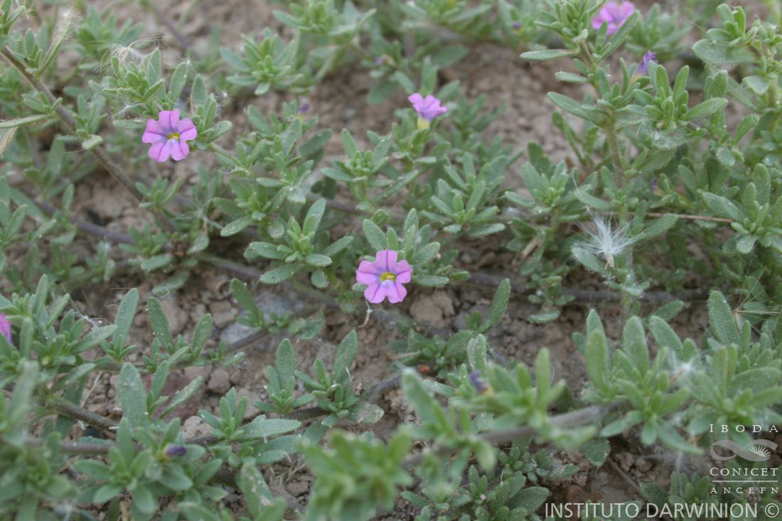 Hierbas anuales, reptantes; tallos herbáceos, muy ramificados, postrados, radicantes, a veces con disposición radial, indumento pubérulo, glanduloso; entrenudos menores de 20 mm, braquiblastos presentes. Hojas sésiles, sin callosidad basal en el envés; láminas lineares o estrechamente oblongas, de 5-12(-20) × 0,4-2(-5) mm, de base cortamente atenuada y ápice obtuso, carnosas, pubérulo-glandulosas en ambas caras, nervaduras no evidentes. Pedicelo de 1-6(-15) mm, pubérulo; cáliz de 5-10 mm, hendido hasta la mitad de su longitud o más, tubo ca. 2 mm, lóbulos estrechamente oblongos, oblongo-lanceolados o estrechamente espatulados; corola infundibuliforme, tubo de 6- 8(-9) mm, garganta amarilla, limbo de 5-7 mm de diámetro, rojizopurpúreo o rosado, lóbulos retusos, ápice abruptamente agudo o apiculado; estambres incluidos, en tres niveles, filamentos glabros, con porción libre de 2-2,5 mm, 2,7-3 mm y 3,5-4 mm respectivamente y porción adnata ca. 2 mm, anteras ca. 0,5 mm, no conniventes; ovario ovoide, de 1-1,5 mm, estilo de 3-4 mm, ápice curvo, estigma elipsoide. Cápsula ovoide, de 3-5 × 2-3 mm; pedicelo fructífero de 2-6(-10) mm; semillas esferoides, angulosas, ca. 0,5 mm.