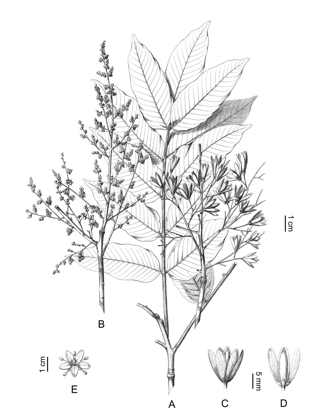 Árboles hasta de 12(-15) m de alto. Hojas con pecíolos de 3-5,5(-8) cm de largo; folíolos 5-7(-11), subsésiles, elípticos a ovados, de 3-12 × 2,5-6 cm, ápice acuminado o agudo, base obtusa a subcordada, asimétrica, margen entero, algo sinuoso, glabra excepto por la nervadura central pilosa. Inflorescencias de 20-30 cm de largo. Flores con pedicelos de 2-3 mm de largo. Flores estaminadas con lóbulos del cáliz de 1-1,5 mm de largo; pétalos de 2-2,5 cm de largo. Flores pistiladas con sépalos ca. 0,5 cm de largo; pétalos obovados, ca. 0,25 cm de largo. Fruto de 1-1,2 × 0,3-0,4 cm.